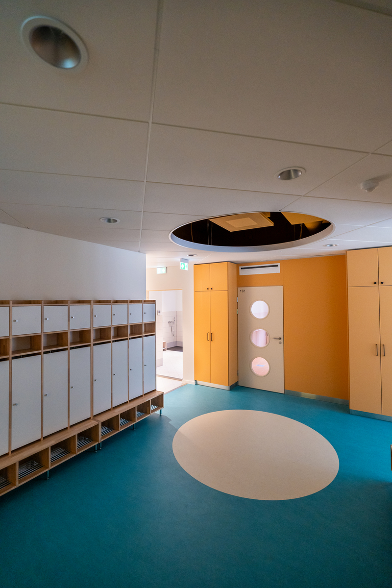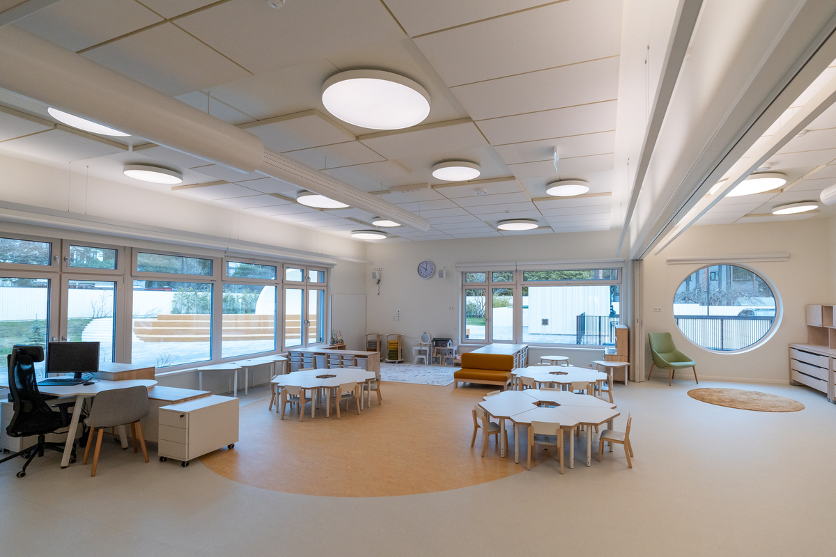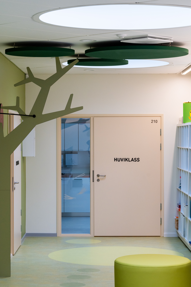 Carefully chosen materials and smart design solutions were key in creating an environment where children and staff can thrive. Acoustic comfort played a central role, as a calm sound environment is essential for concentration, communication and recovery. In the halls, Ecophon Akusto™ One/Texona panels in the shades Garlic and Ginger add both visual character and excellent sound absorption. In the group rooms and other learning spaces, Ecophon Industry™ Modus TAL and Ecophon Focus™ Ez panels secure a balanced and supportive acoustic atmosphere.