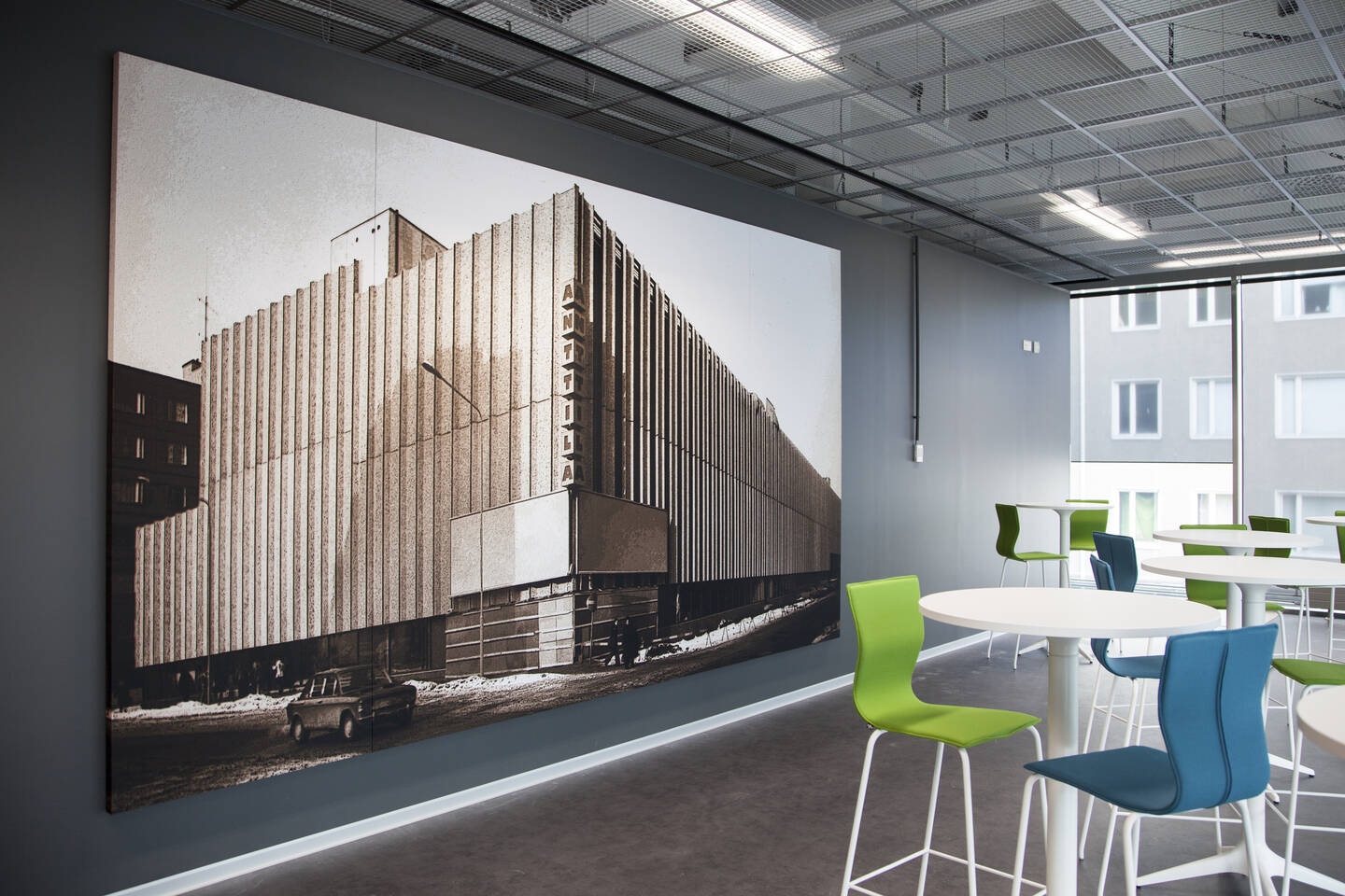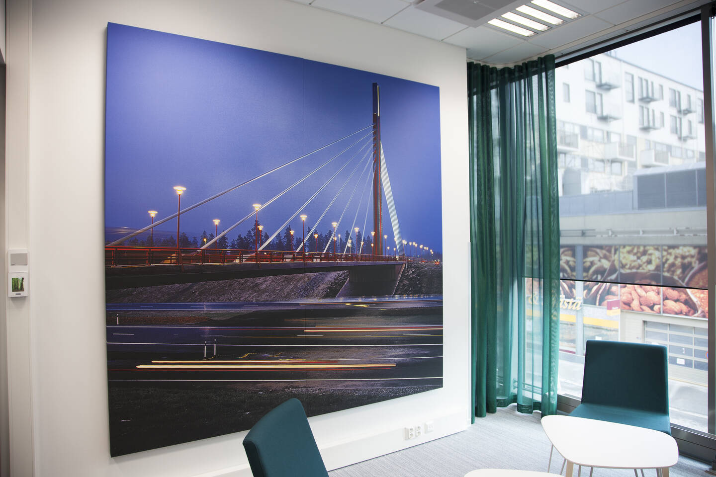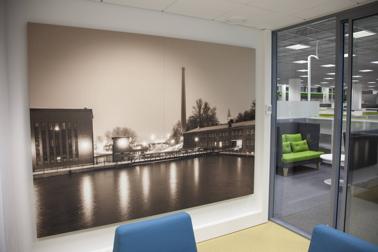 – Neuvottelutilamme on nimetty ja sisustettu tekemiemme kohteiden mukaan, ja akustiikkalevyjen kuvituksena on käytetty esimerkiksi Näsinneulaa ja Tampereen rantatunnelia. Tarjoamme toimistollamme käytettyjä ratkaisuja myös asiakkaillemme, ja tiloissamme käykin runsaasti vierailijaryhmiä niitä tutkimassa.