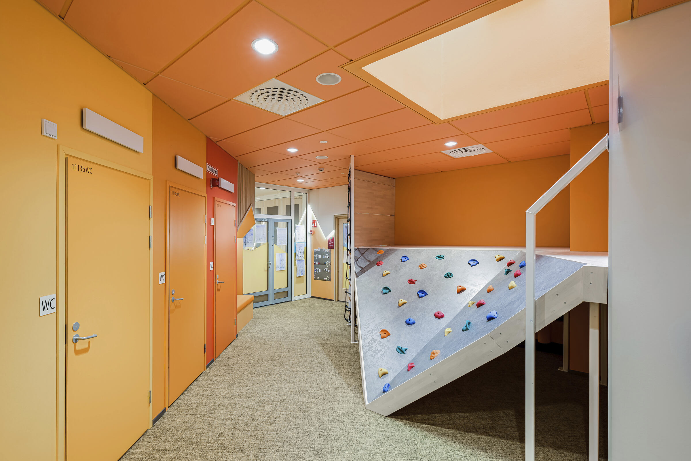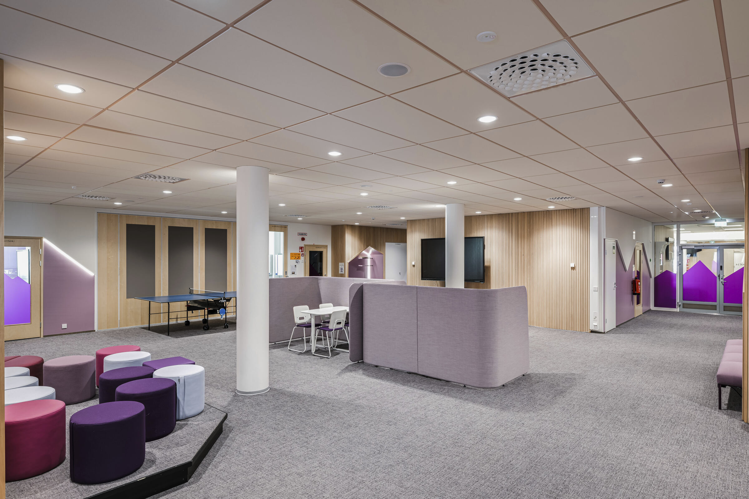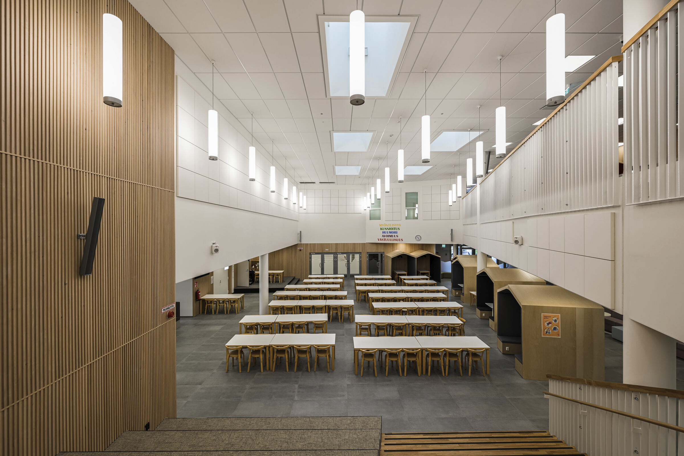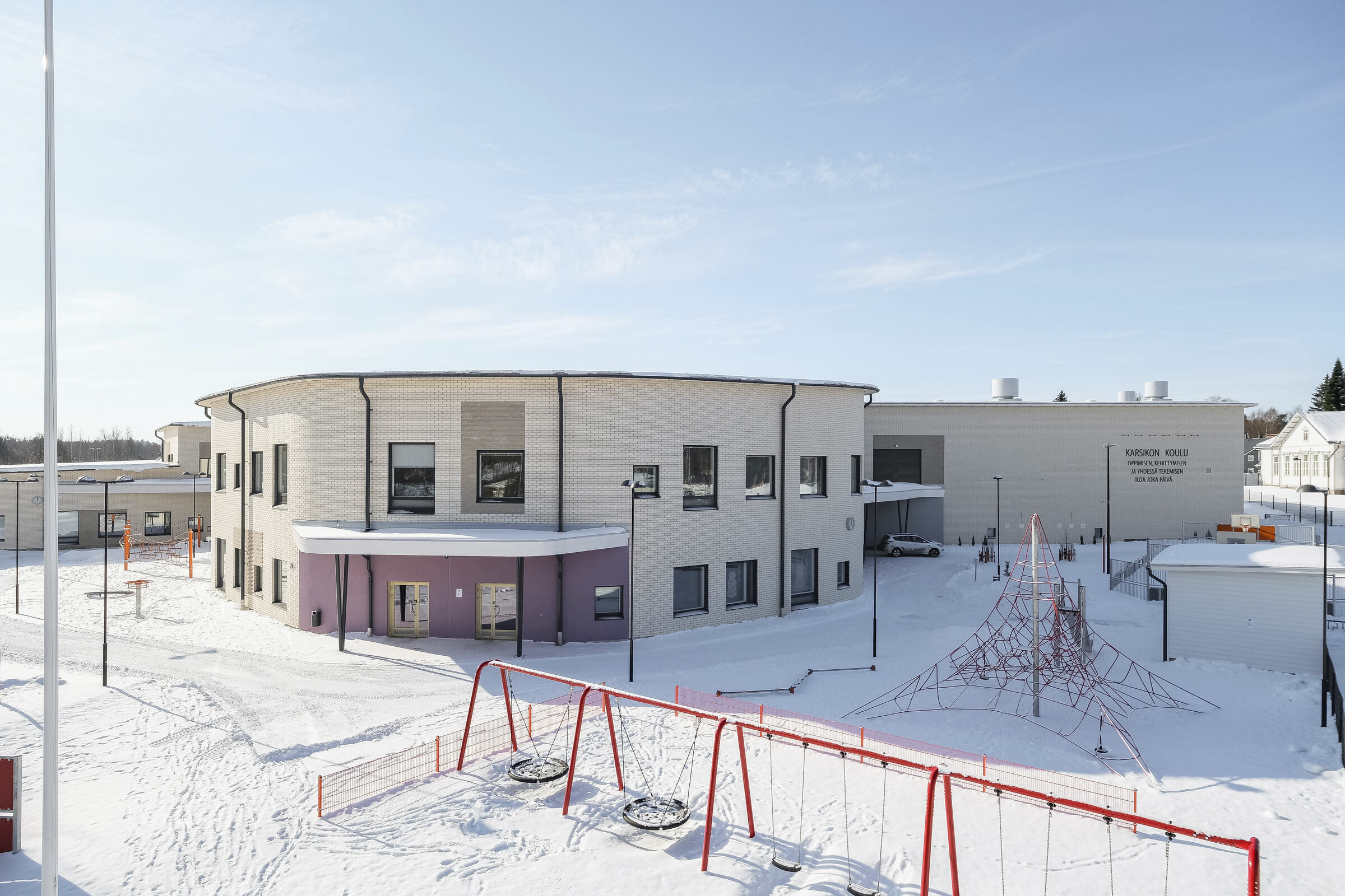Vuonna 2022 valmistuneessa Karsikon koulussa suurin osa alakatoista on toteutettu hauskan värisillä Ecophonin Focus E -akustiikkalevyillä, jotka vaimentavat tehokkaasti melua niin luokkahuoneissa kuin avoimissa oppimisympäristöissä. Lehden muotoiset, leijuvat Solo-akustiikkapaneelit luovat aulaan veikeän tunnelman.