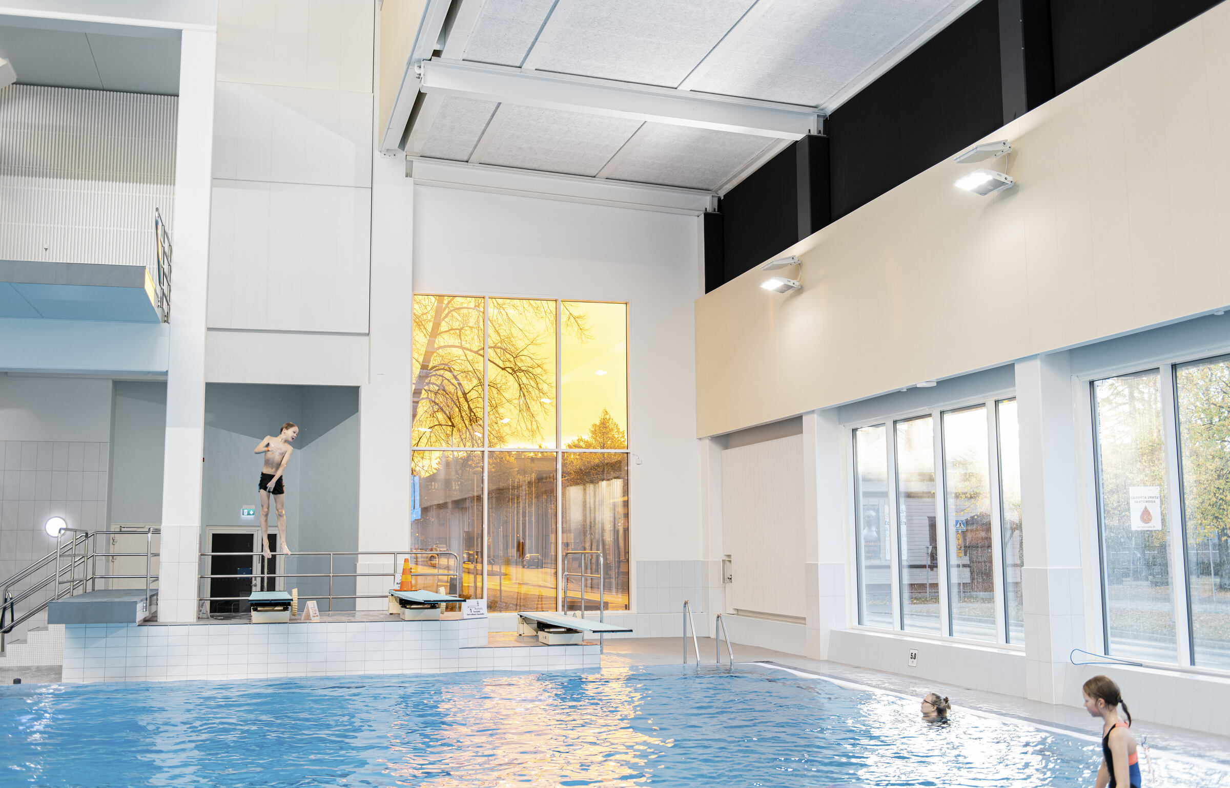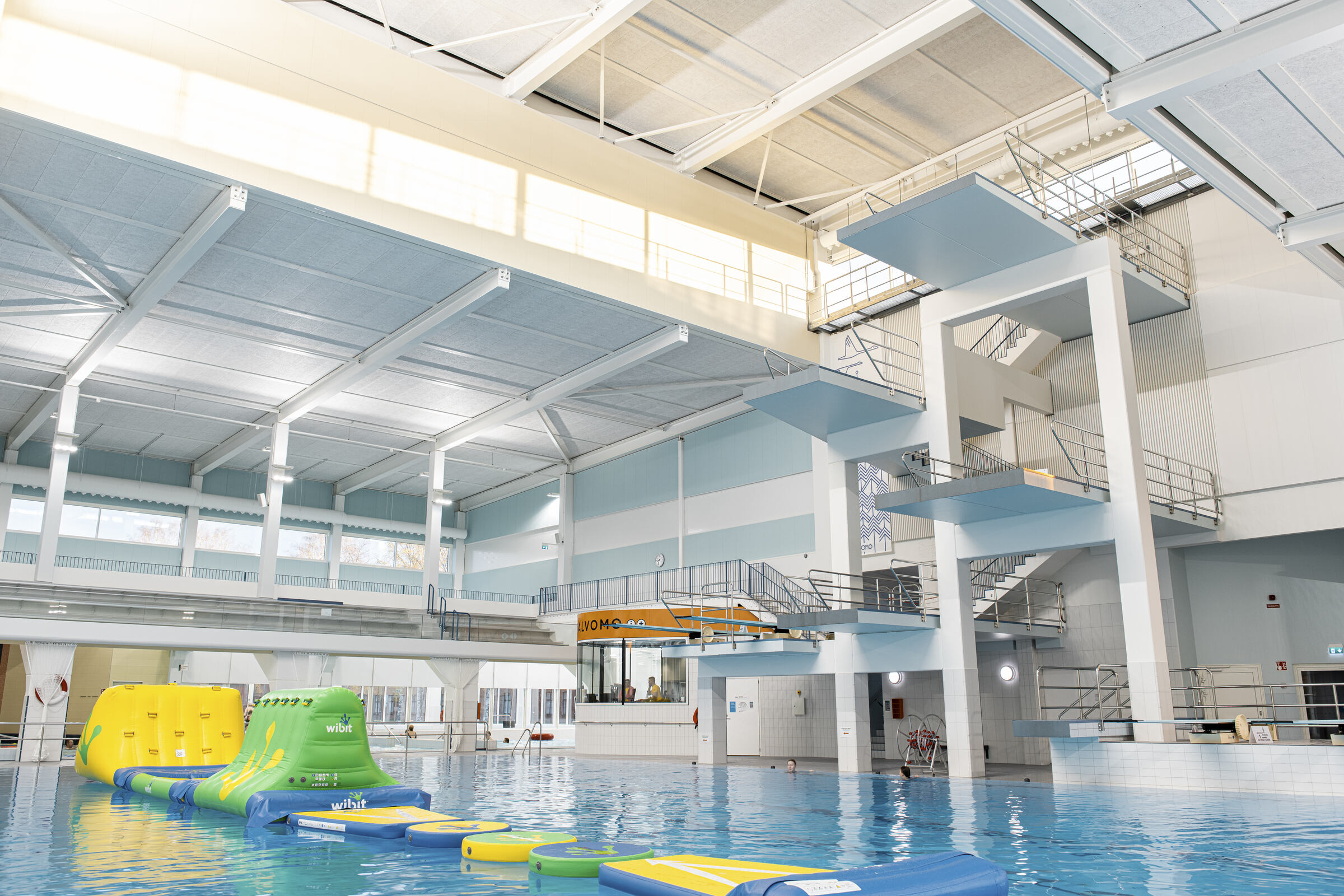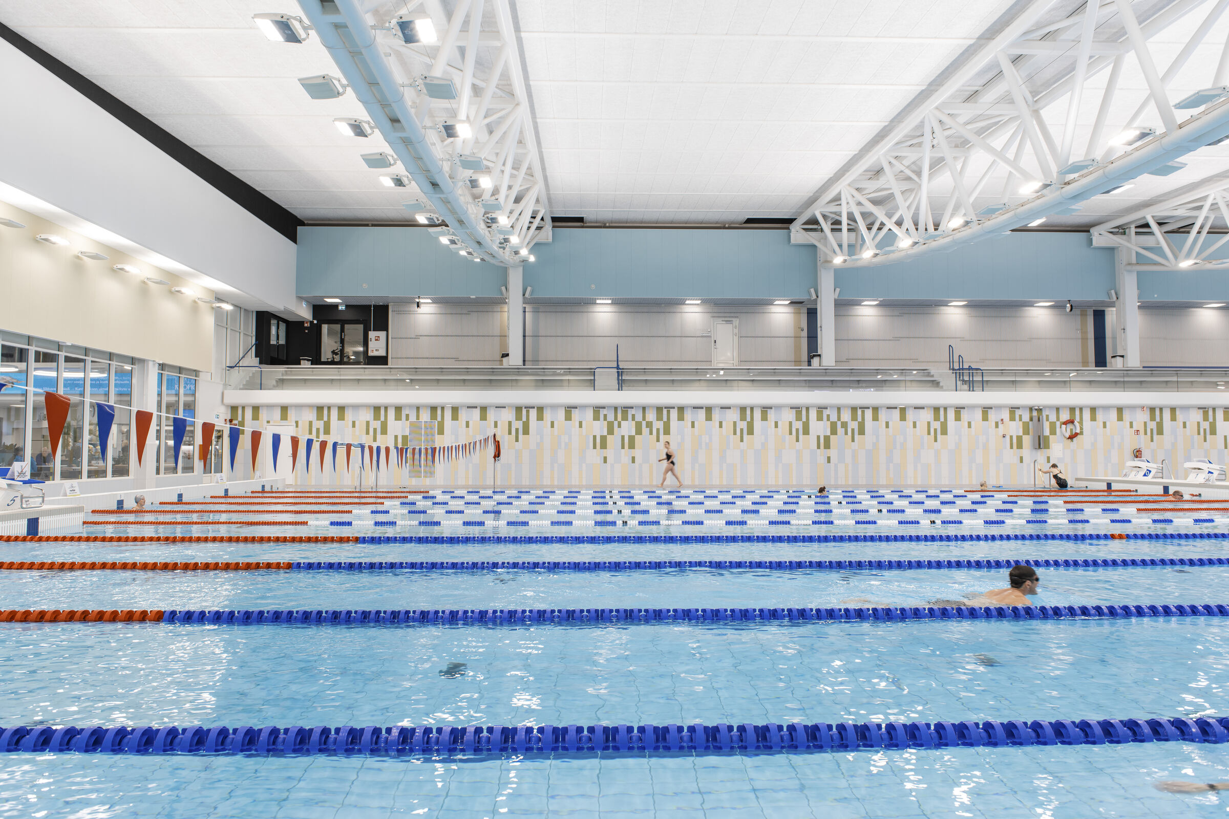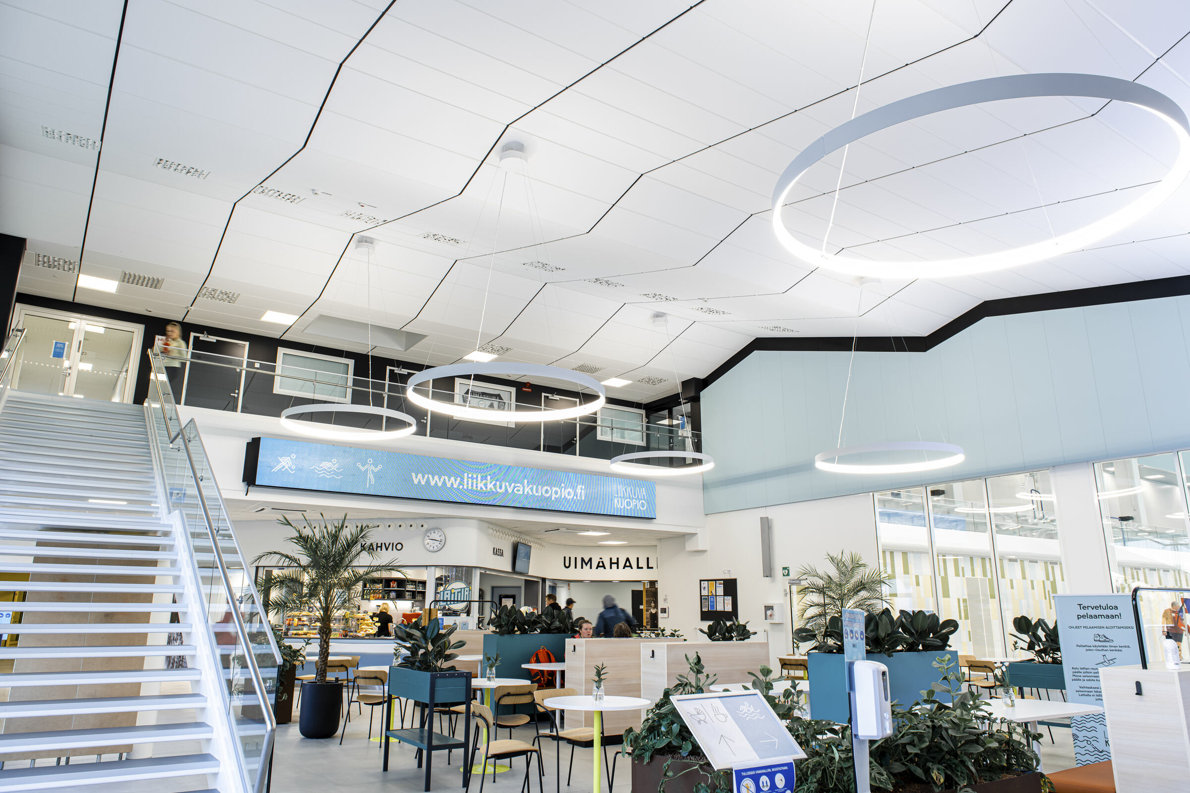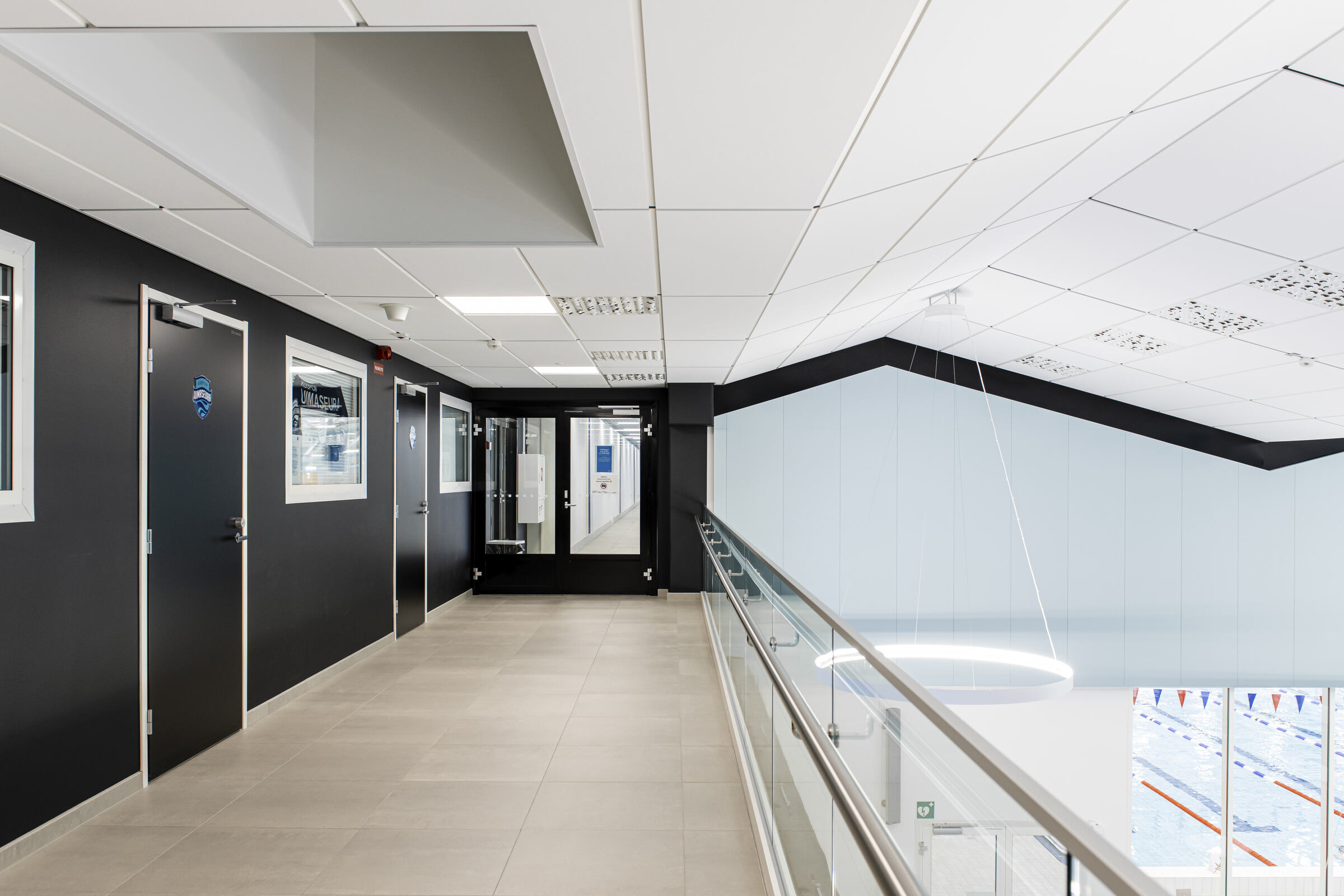 Uimahallin aulatilan aaltoileva alakatto on toteutettu Ecophon Focus E XL -levyllä. Pääkannatinlinjat ovat mustaa T-24 listaa. Aulan ja allasalueella seinät on lisäksi akustoitu Ecophonin Akusto Wall -paneeleilla.