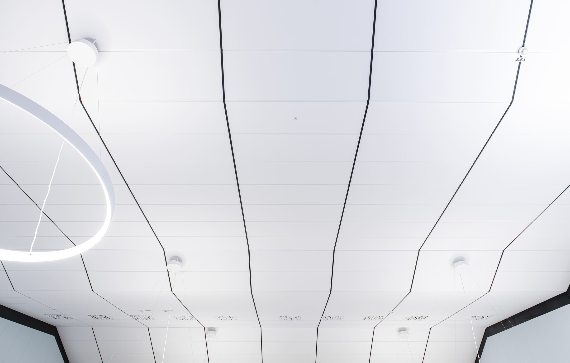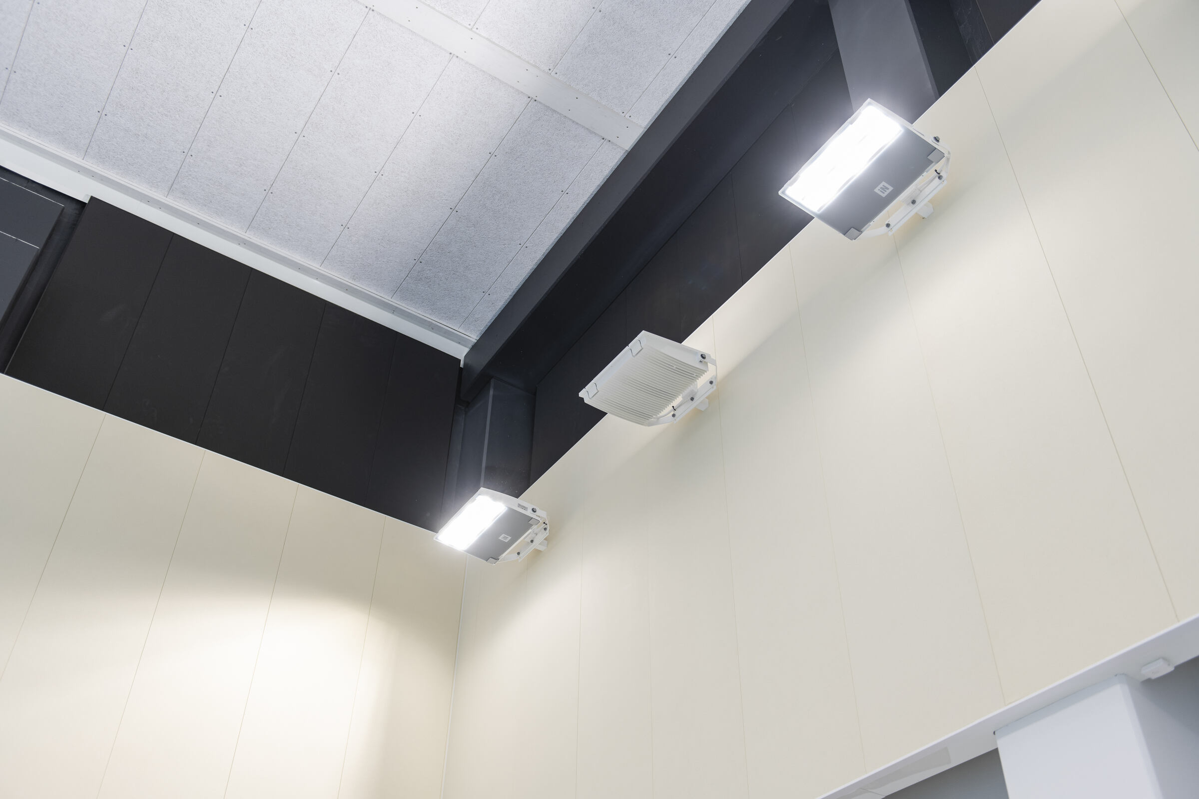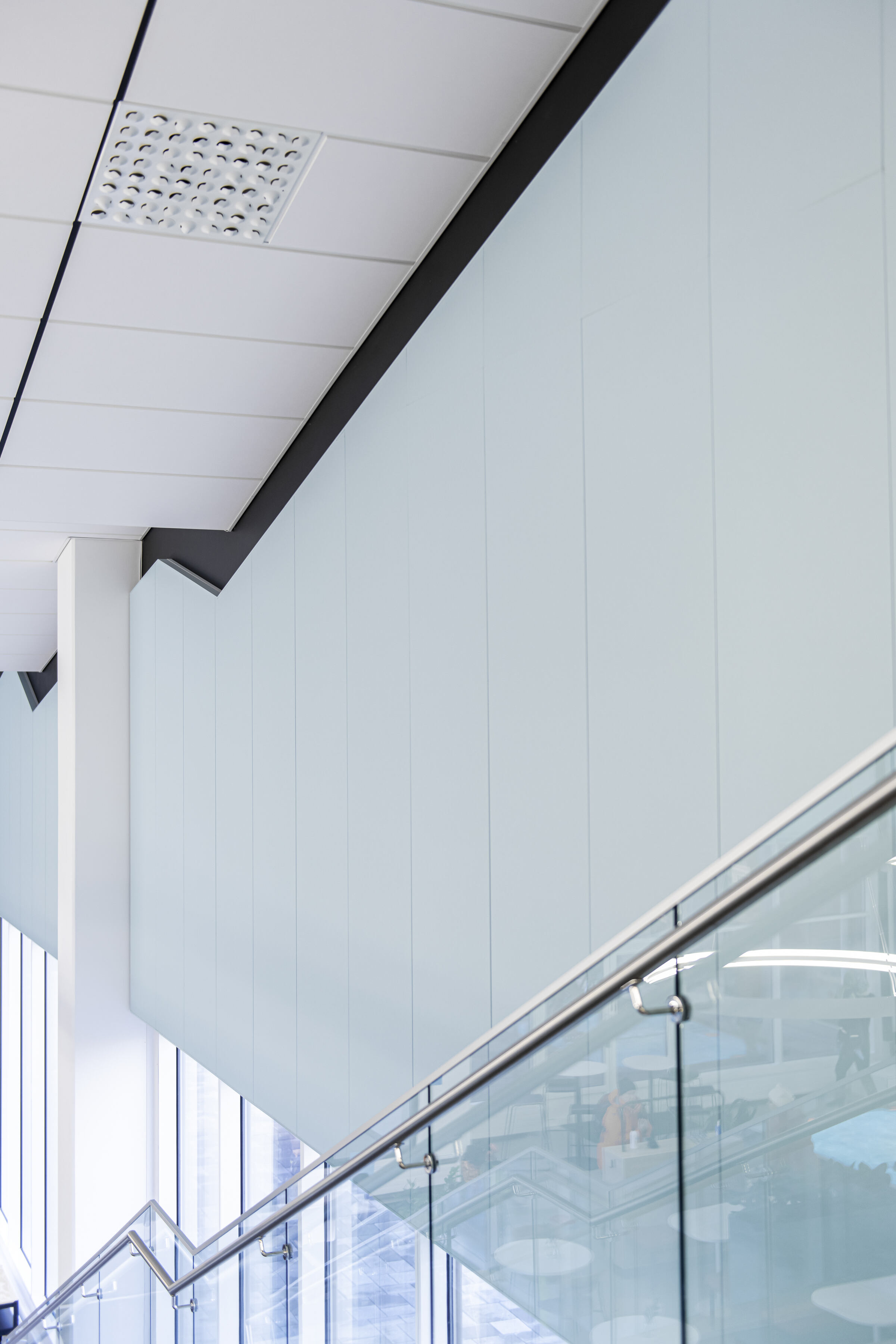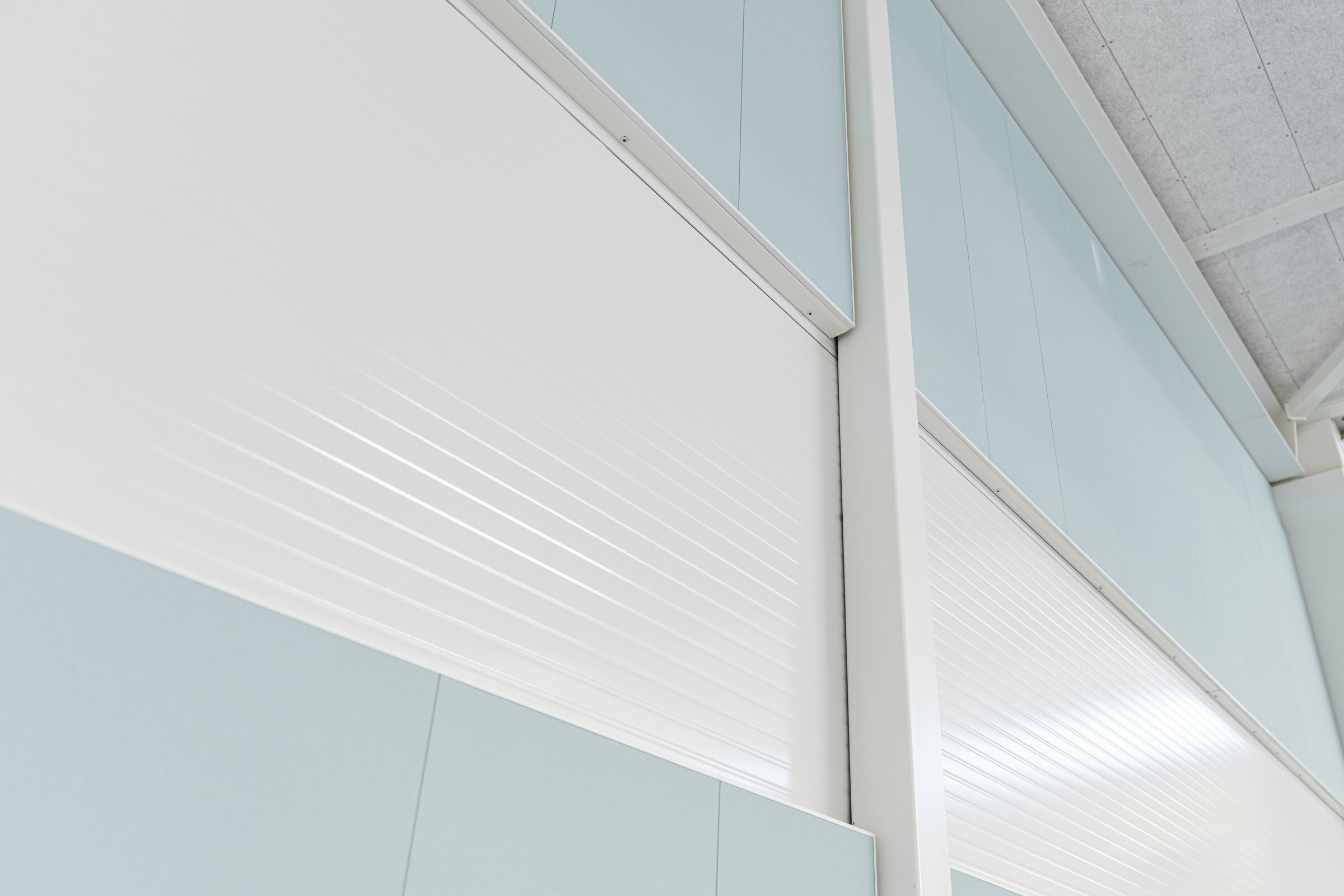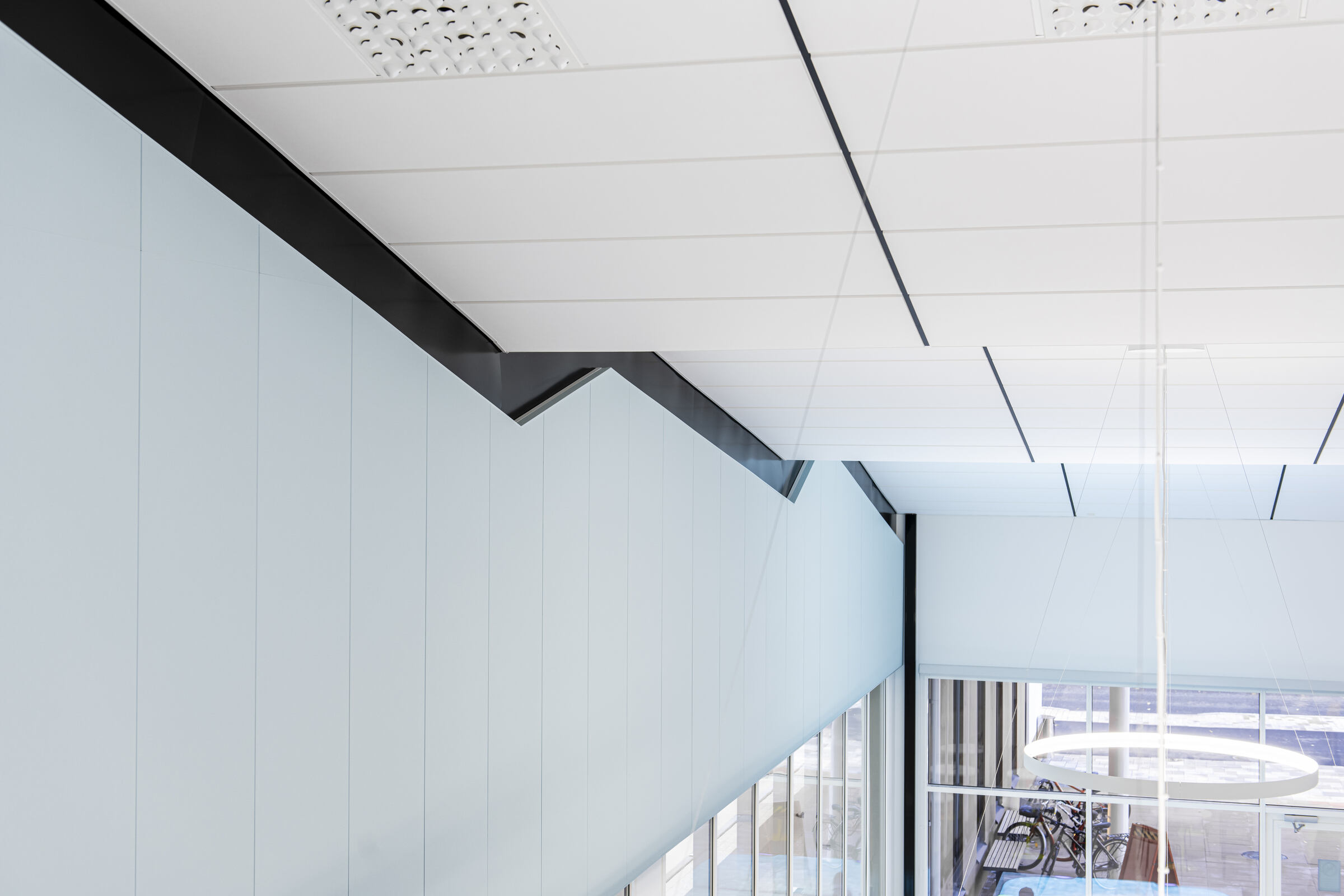 Uimahallin aulatilan aaltoileva alakatto on toteutettu Ecophon Focus E XL -levyllä. Pääkannatinlinjat ovat mustaa T-24 listaa. Aulan ja allasalueella seinät on lisäksi akustoitu Ecophonin Akusto Wall -paneeleilla.
