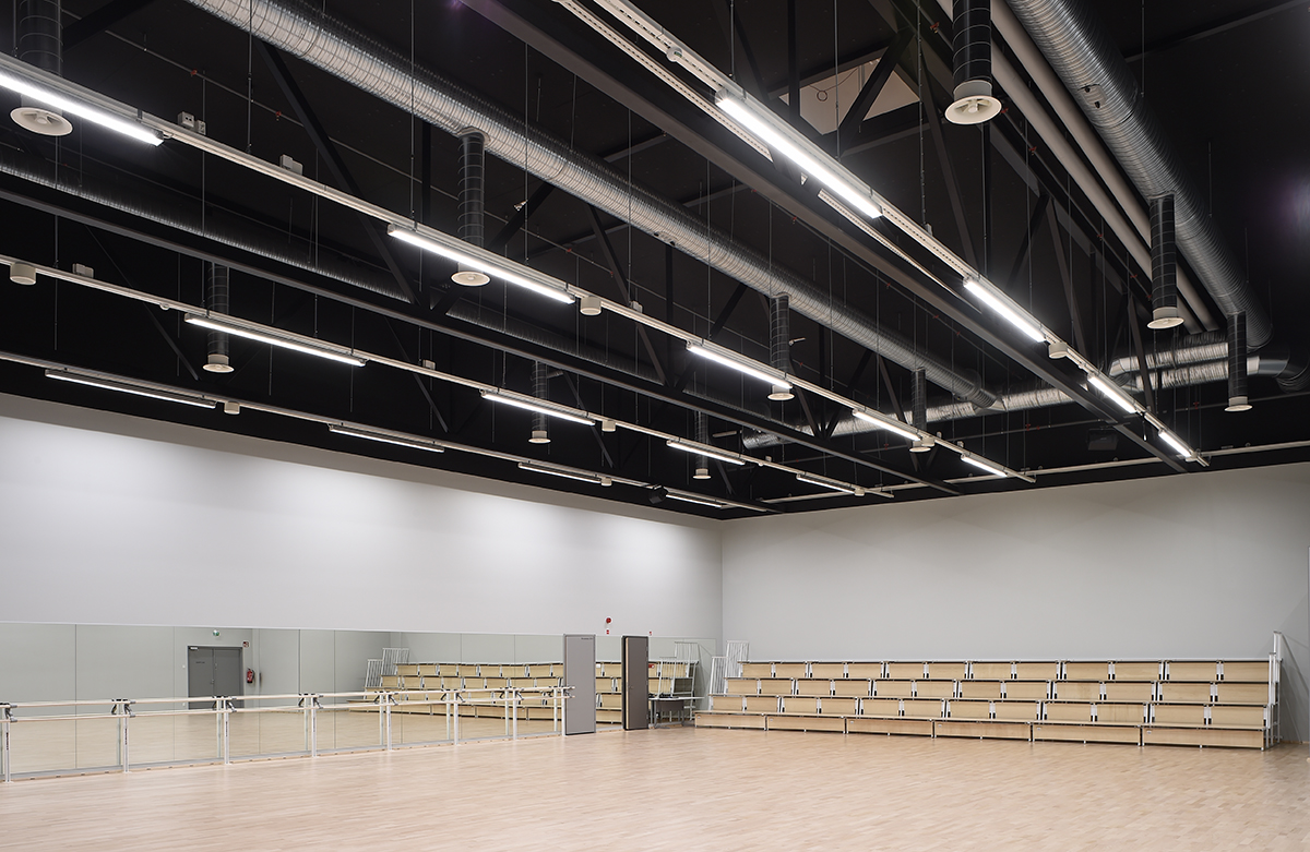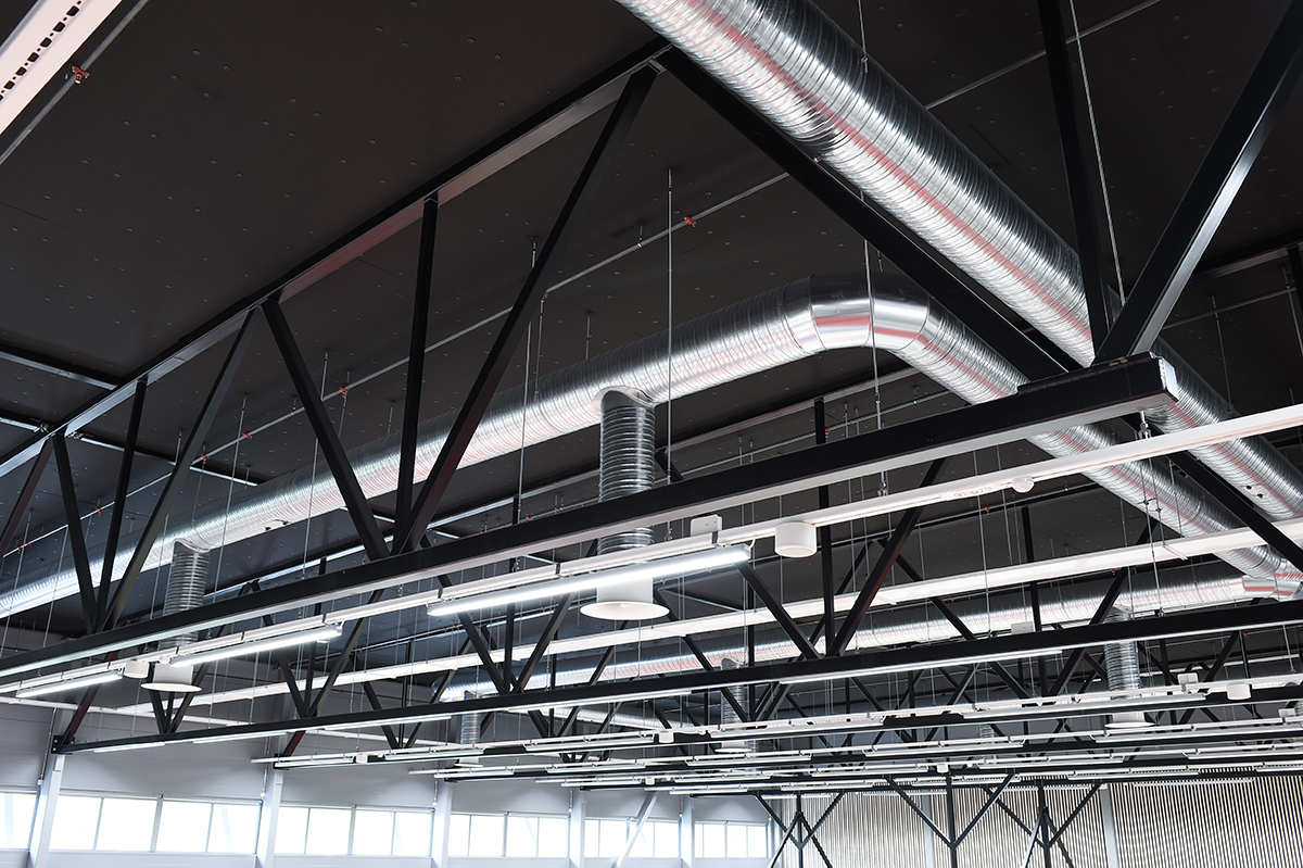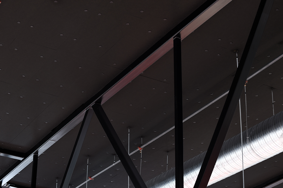 Laajennusosan julkisivujen tumma ilme jatkuu sisätiloissa, jossa hallin hyvästä ääniympäristöstä huolehtivat mustat Ecophon Industry -sarjan tuotteet. Ecophon Industry Modus TAL on erityisesti teollisuuskohteisiin ja halleihin sopiva hyvien akustisten ominaisuuksien perustuote, jota on saatavana mustana, valkoisena ja harmaana.