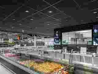 Turun K-Supermarket Herttuankulman palvelutiskin yläpuolelle asennettu Ecophon Hygiene™ Black tarjoaa erinomaisen äänivaimennuksen ja tyylikkään mattapinnan, mikä tukee sujuvaa kommunikointia ja rauhallista asiointikokemusta.