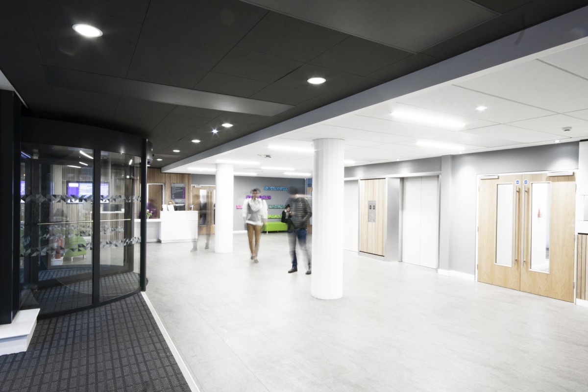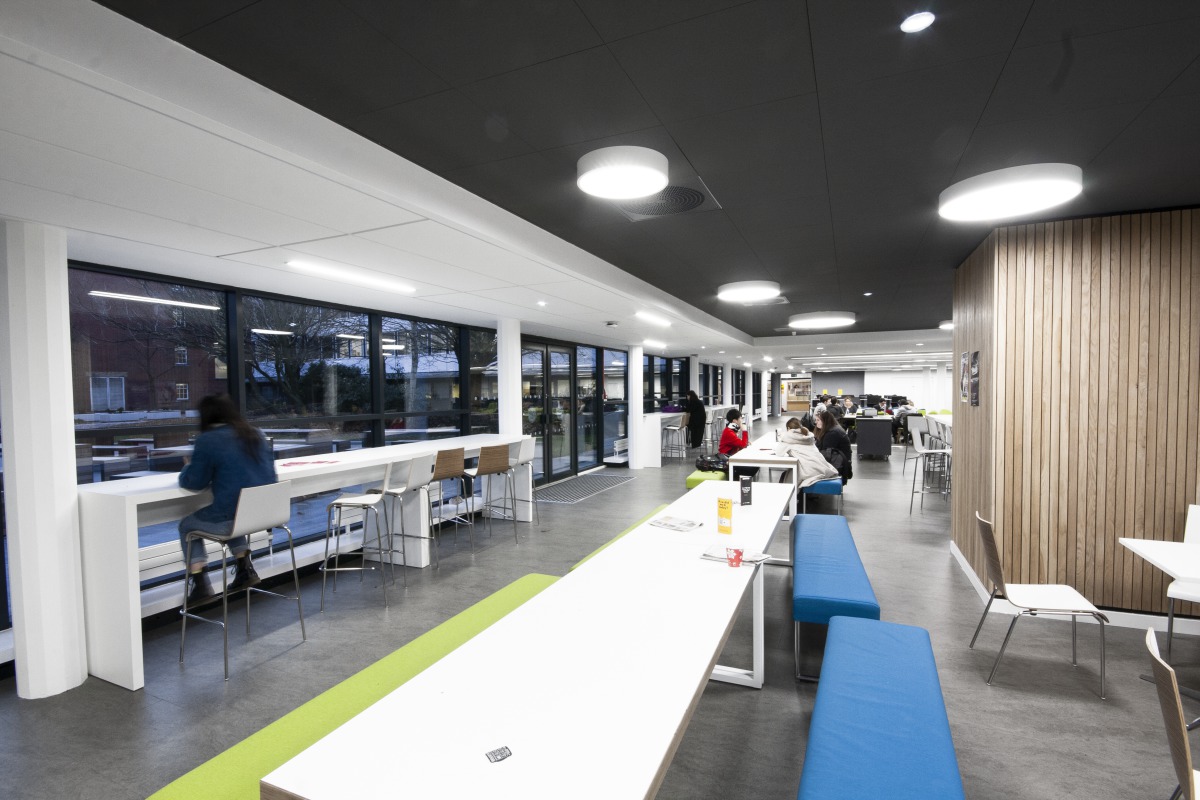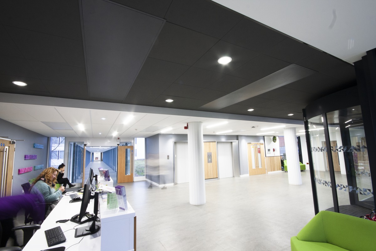 Fiona a décrit comment Halliday Meecham a travaillé avec Ecophon pour trouver des solutions. « L'objectif était d'augmenter la hauteur du plafond dans le hall d'entrée existant de l'aile sud, avec son espace café et ses rangées d'ordinateurs. Conformément aux exigences de l'université, tous les plafonds doivent être accessibles et facilement démontables. Le plafond Ecophon Focus fournissait l’accès, tout en conservant l’aspect «lisse» souhaité. Nous avons choisi d'installer le plafond gris à un niveau supérieur, avec des installations d'éclairage et un plafond blanc contrastant avec éclairage de travail. Les ventilations et les panneaux radiants ont été assortis aux dalles pour se fondre dans le plafond.’