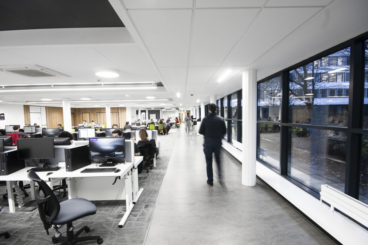 Le panneau Focus E gris a été installé à un niveau supérieur, avec des luminaires et un plafond blanc contrastant et un éclairage de travail.