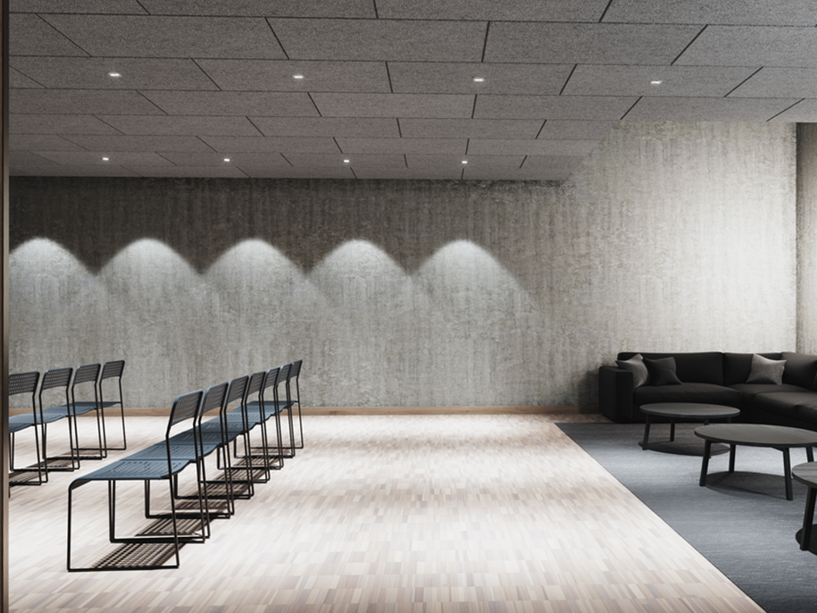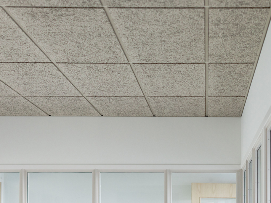 Facile à installer, Ecophon Saga™ D est un système de dalles à ossatures cachées et chants biseautés, qui crée une rainure discrète entre chaque panneau en laine de bois. C’est une solution particulièrement élégante, adaptée aux espaces au design exigeant et performante en termes d'absorption acoustique.