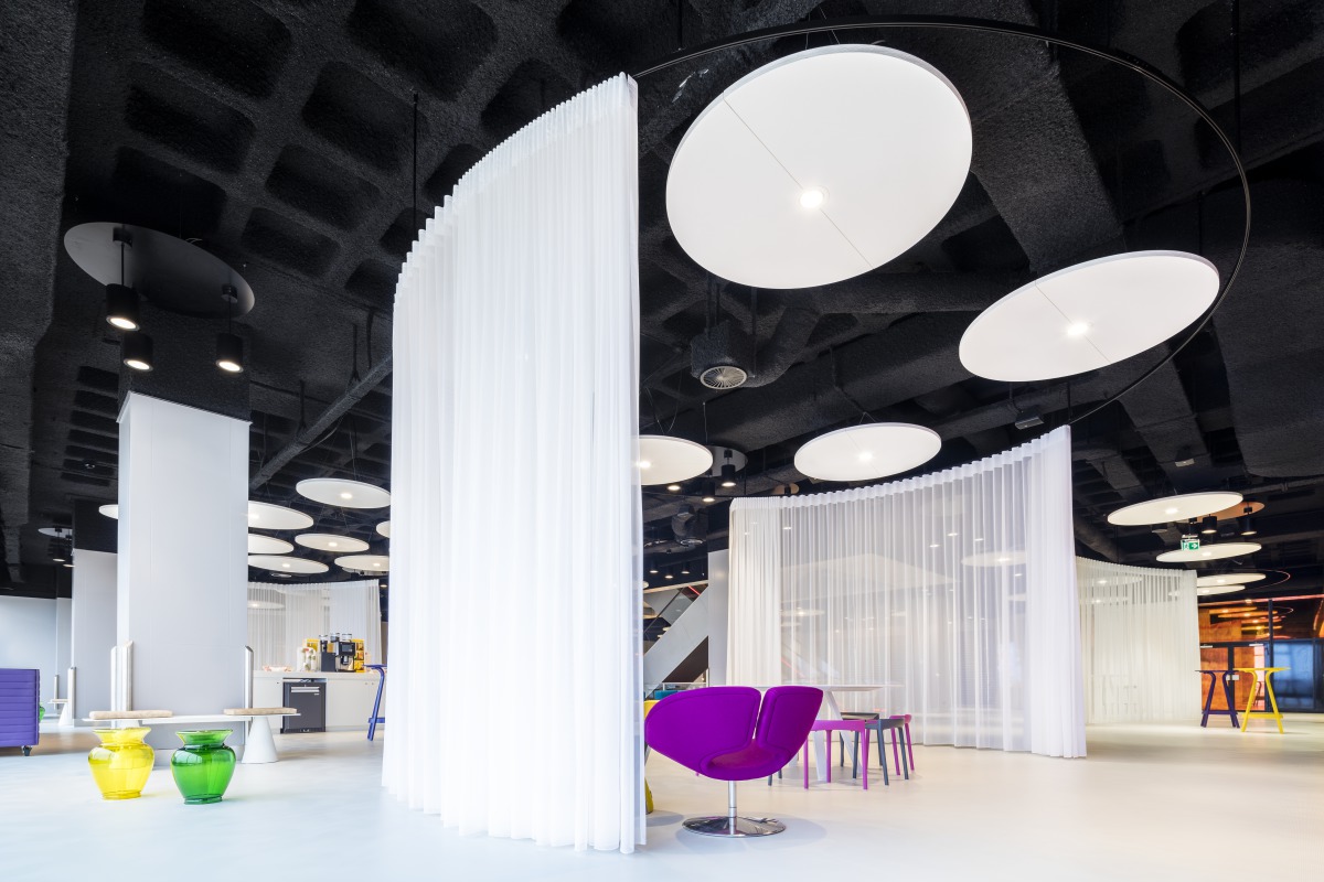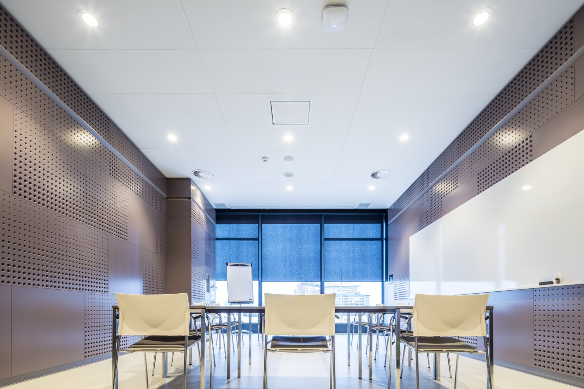 “Une bonne acoustique est vitale pour la façon dont nous vivons et utilisons le MeetUp Plaza et ses salles de conférences », explique le designer d'intérieur Kraaijvanger Leendert Spreij. "Il faut d'abord reconsidérer la capacité à se rencontrer, s'isoler et à travailler. Intégrer la technologie et de bonnes installations acoustiques joue un rôle très important dans ce domaine. Nous avons atteint un nouveau niveau de confort élevé en utilisant une gamme de matériaux absorbants acoustiques pour fournir une acoustique optimale. Nous avons installé des unités flottantes suspendues Solo Circle XL dans la plaza de MeetUp. Le plafond est lui même enduit de peinture noire acoustique, mettant en évidence les panneaux Solo et créant un phénomène d'optique : les panneaux semblent être séparés de la structure du bâtiment sous-jacente. Dans les salles de conférences, le plafond démontable à ossatures cachées Focus Ds était le système le plus approprié.”