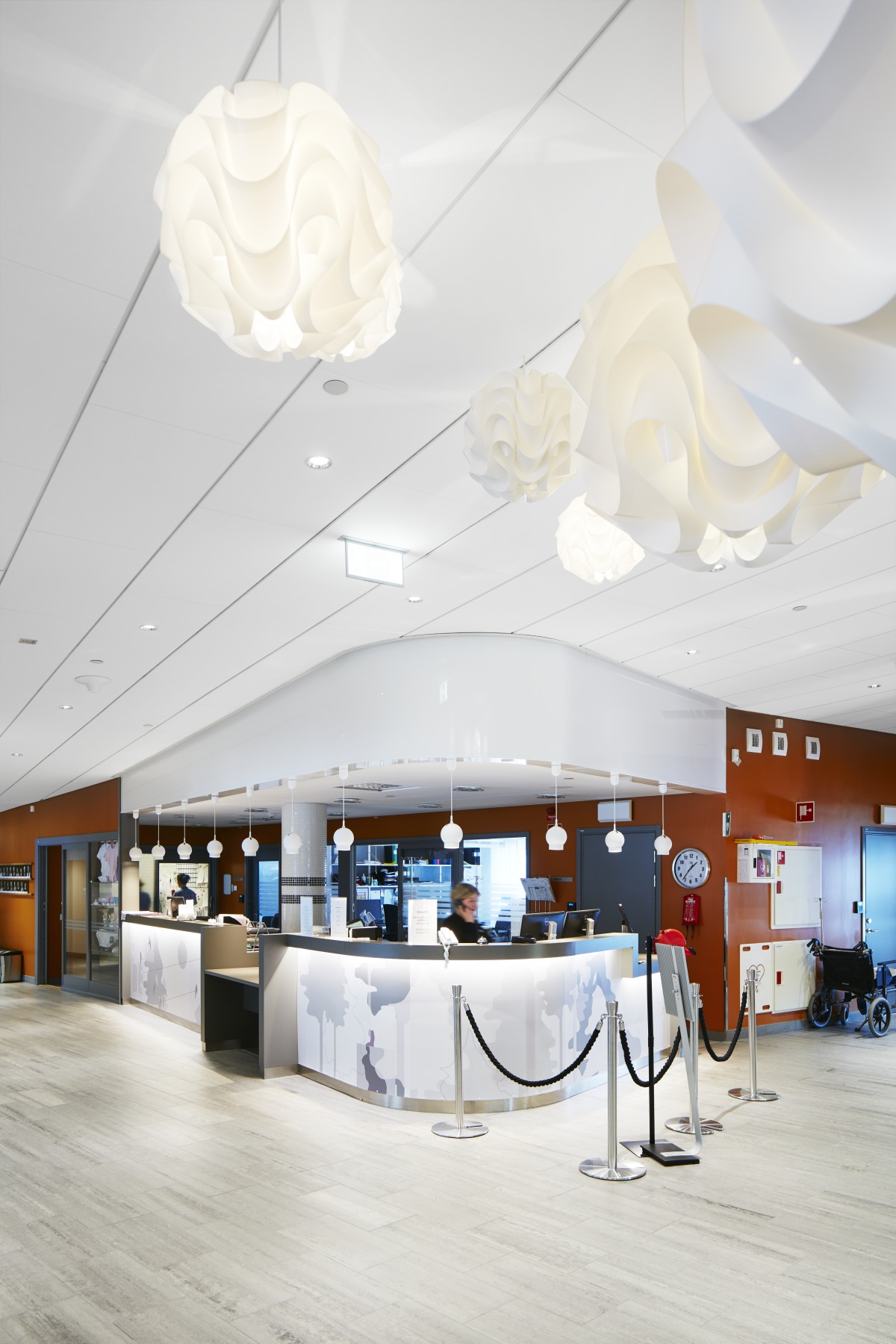 L’entrée est aérée et accueillante, avec des éclairages et des œuvres d’art de goût, créant un espace confortable ouvrant naturellement sur une zone ressemblant à une réception d’hôtel. Le plafond a été choisi avec soin afin d’offrir un environnement acoustique confortable et créer une architecture linéaire qui correspond bien au reste de l’intérieur.