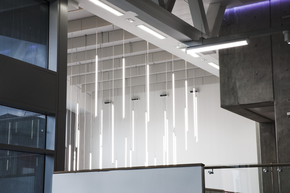 Martin Keogh di Ecophon ha descritto il coinvolgimento di Ecophon nel progetto: "Ecophon è stata contattata per collaborare con l'architetto e l'appaltatore principale nello sviluppo delle specifiche in linea con la strategia acustica. Gli intradossi esposti e un ampio atrio centrale con balaustre aperte possono rivelarsi molto impegnativi dal punto di vista acustico. I deflettori acustici e il montaggio diretto del sistema Master F hanno rappresentato una combinazione ideale, dando l'aspetto estetico richiesto in combinazione alla classe di fonoassorbimento di A. "