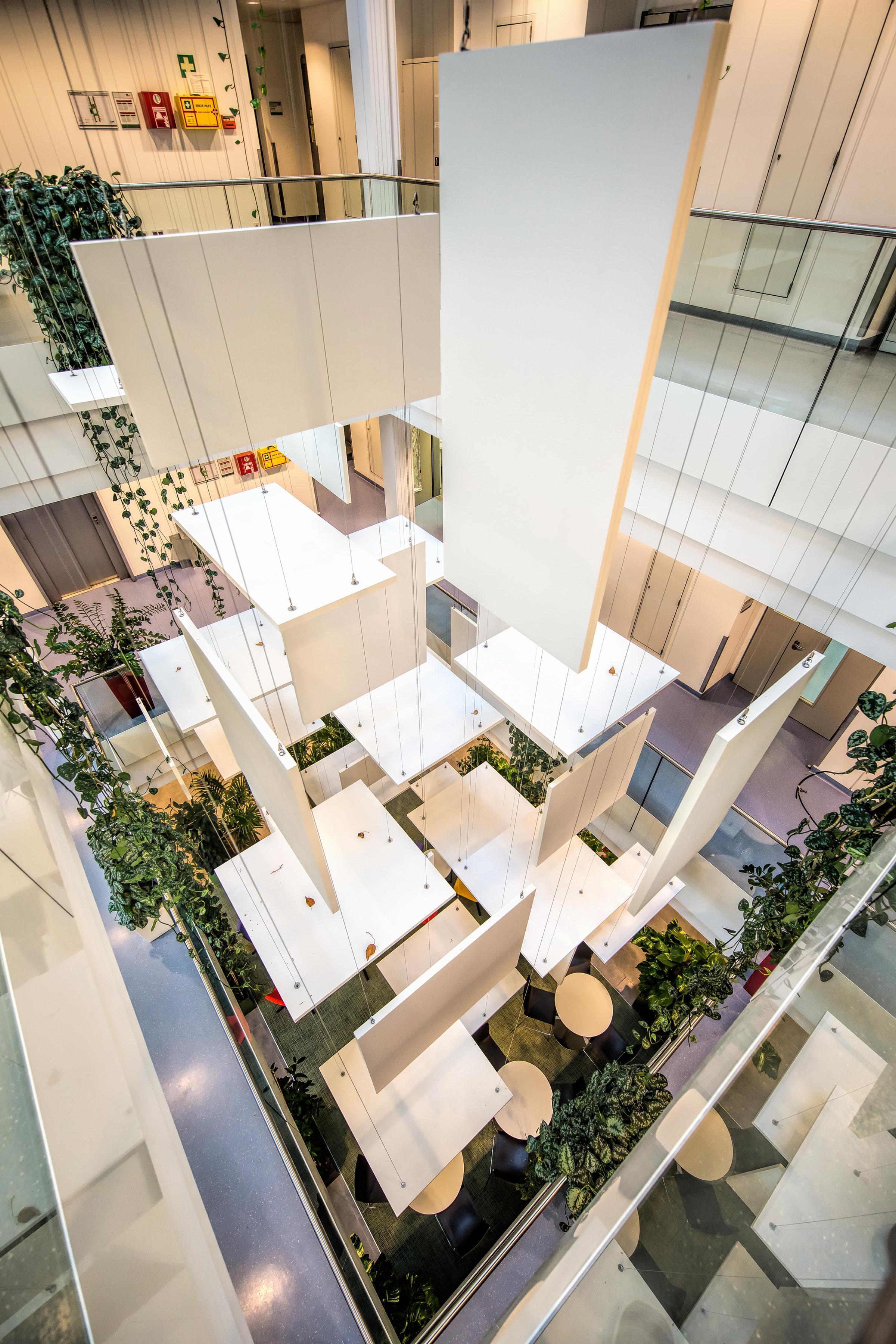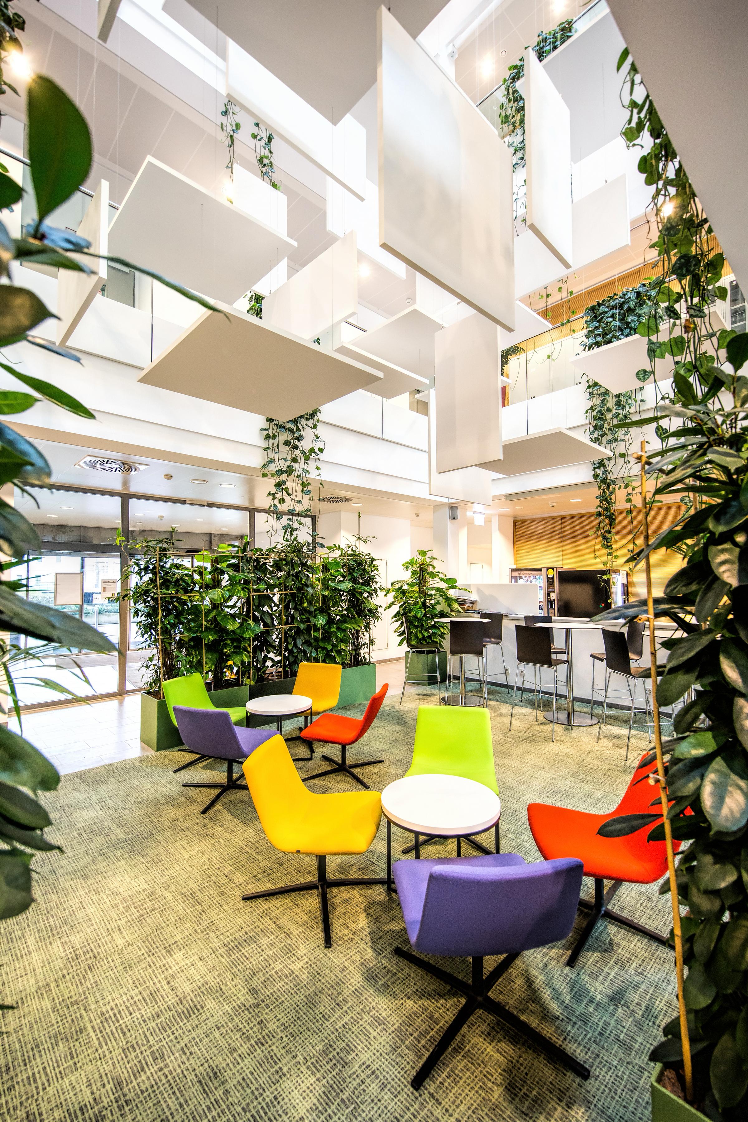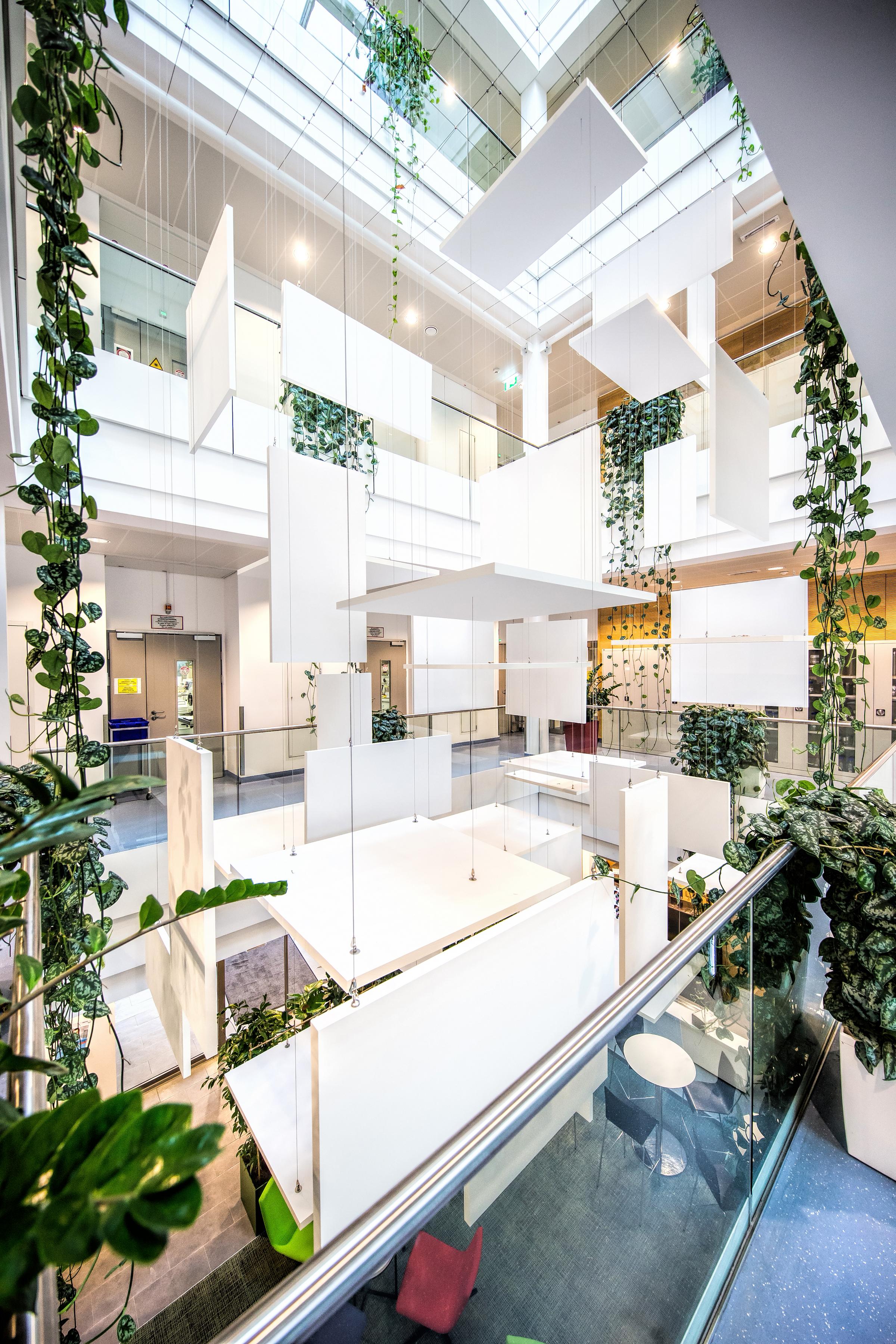 Per mantenere il carattere dell'atrio e la luce naturale, sono stati installati pannelli Ecophon Solo™ a sospensione libera su diversi livelli.Il gioco di sospensioni verticali e orizzontali dei pannelli crea un effetto vivace e si estende su più piani, permettendo di ammirare l'installazione da tutte le angolazioni. In combinazione con le piante appese, si crea un'esperienza armoniosa sia per l'udito che per la vista.