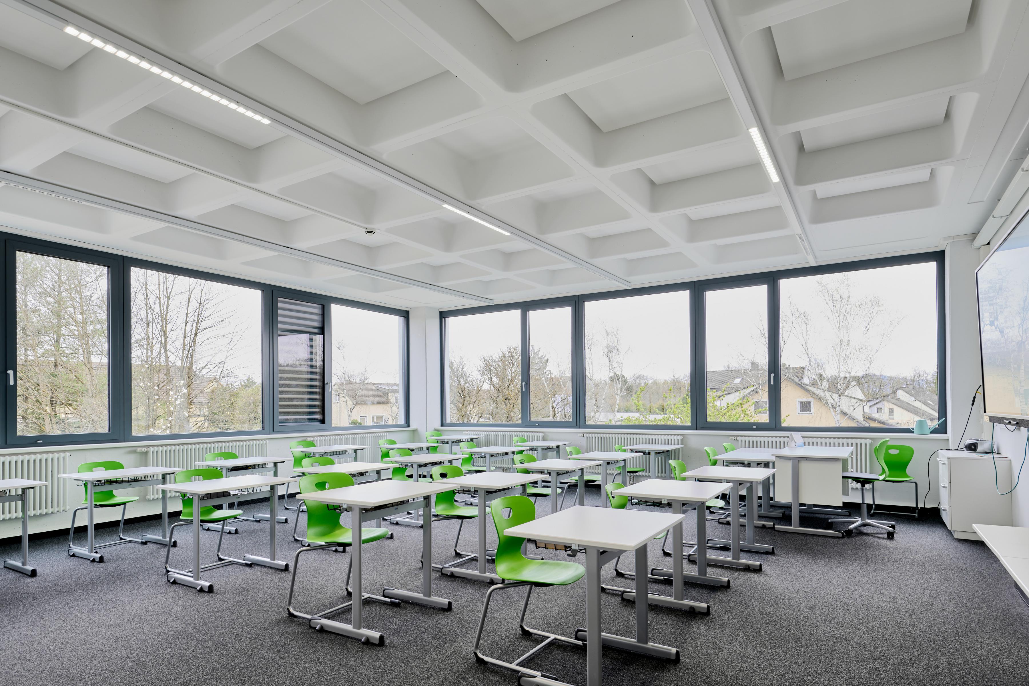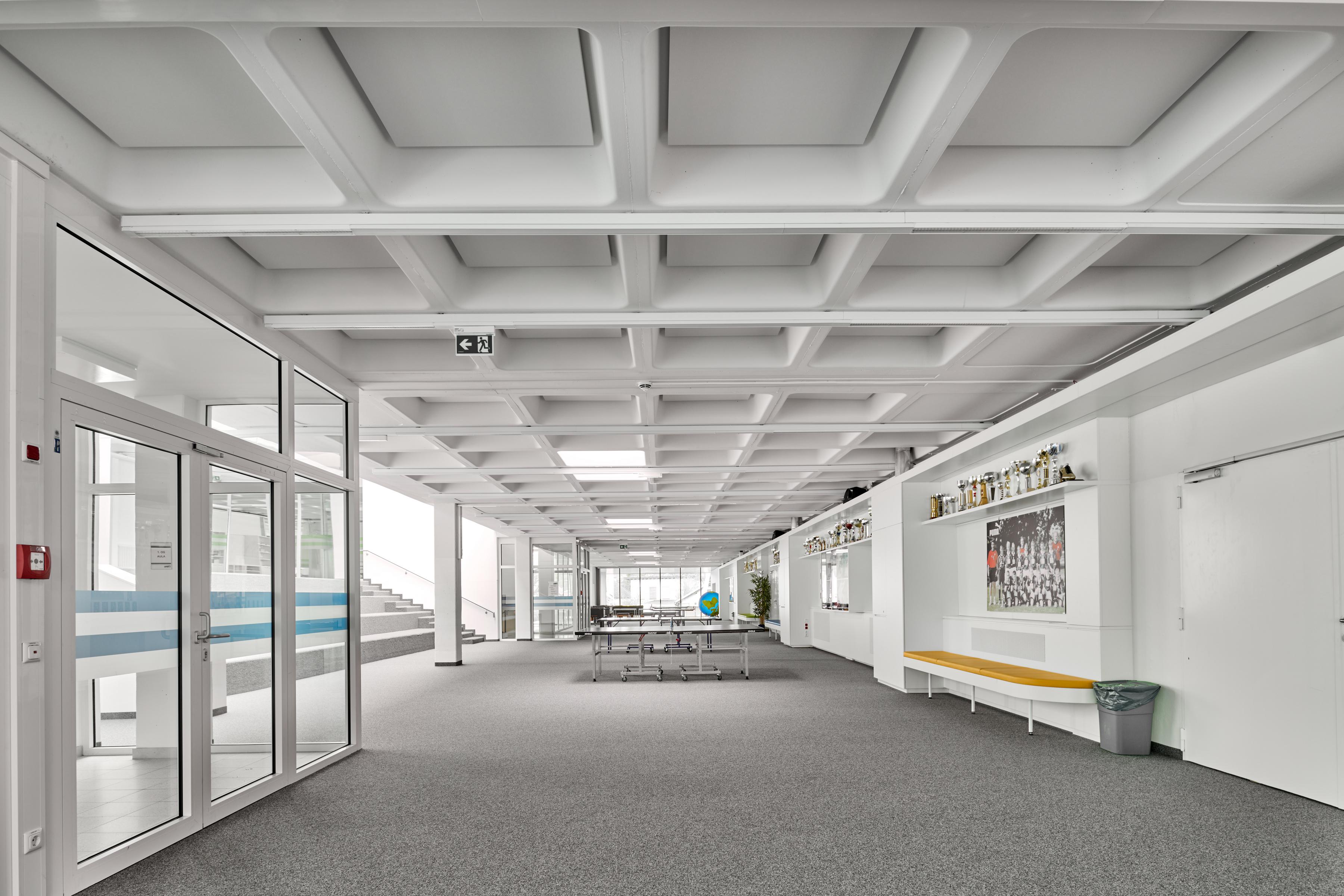 Sia per scopi educativi che per grandi eventi sportivi, è importante che l'acustica della sala sia ottimale. Il soffitto acustico Ecophon Super G™ Plus A, resistente agli urti meccanici, con il suo robusto sistema di griglie, è ideale per l'uso nelle palestre, motivo per cui è stato installato su tutto il soffitto in questo caso. Sulle pareti dietro le tribune sono installati i pannelli acustici Ecophon Akusto™ con la superficie rinforzata Super G.