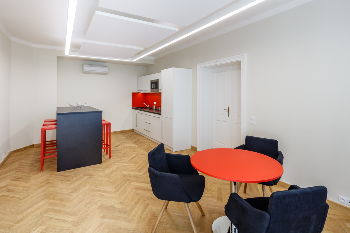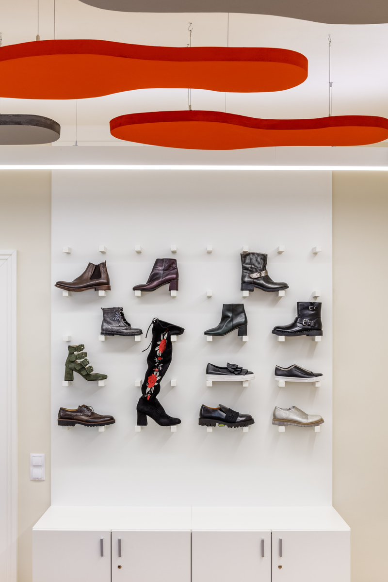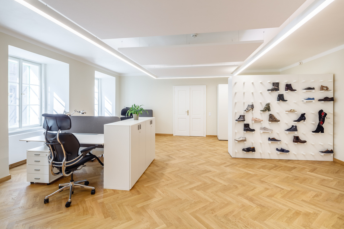 Fin dalle prime fasi del progetto, il team di progettazione ha lavorato a stretto contatto sia con la direzione di Bata che con i dipendenti, per garantire che l'ufficio non solo rispettasse gli standard estetici dell'azienda, ma offrisse anche uno spazio di lavoro confortevole e pratico. La sfida è stata armonizzare il design moderno e pulito con lo status storico protetto dell'edificio. Gli ampi spazi con soffitti alti sono stati trasformati in aree accoglienti e acusticamente confortevoli grazie all'uso di soluzioni acustiche innovative, come soffitti acustici ed elementi sospesi.