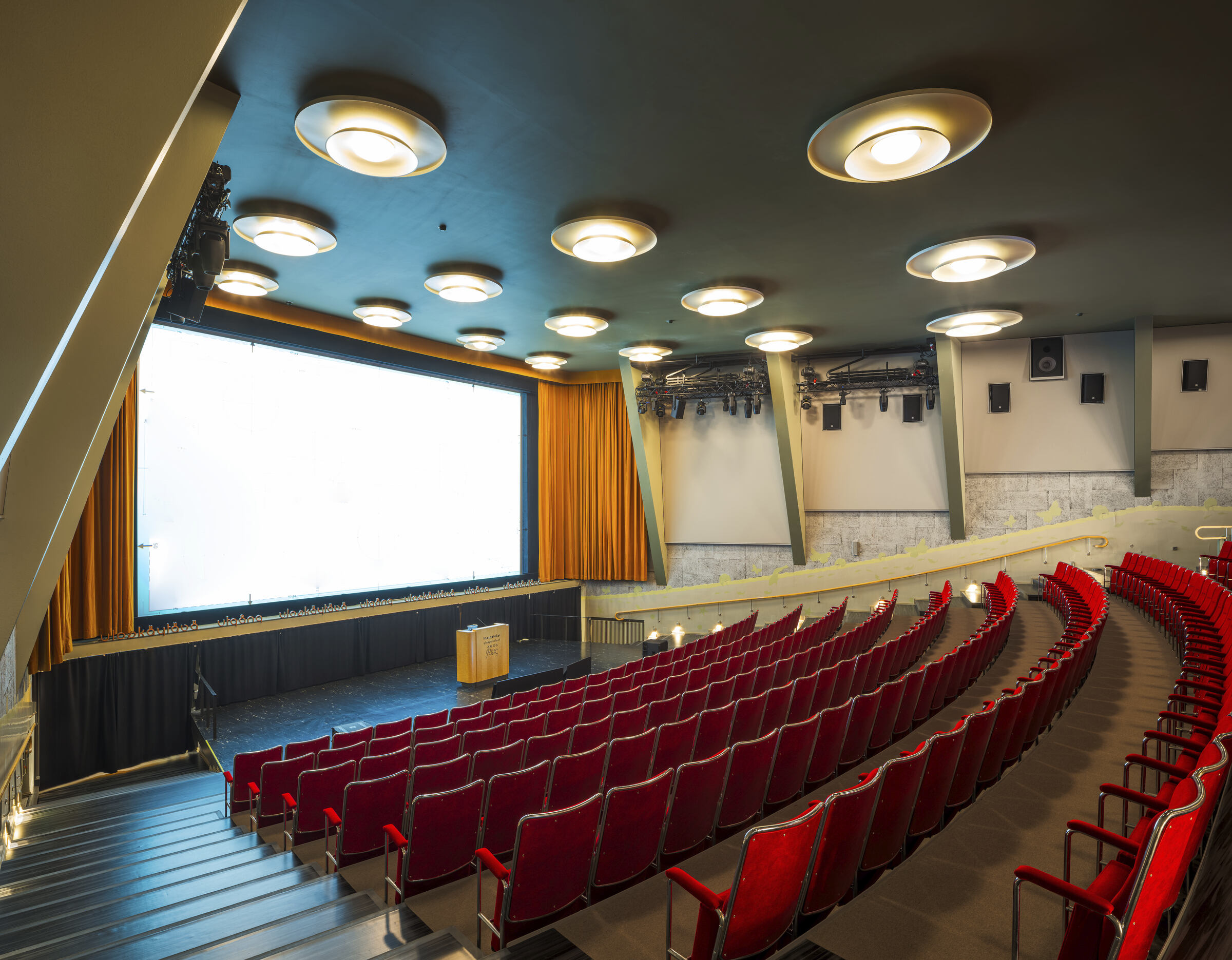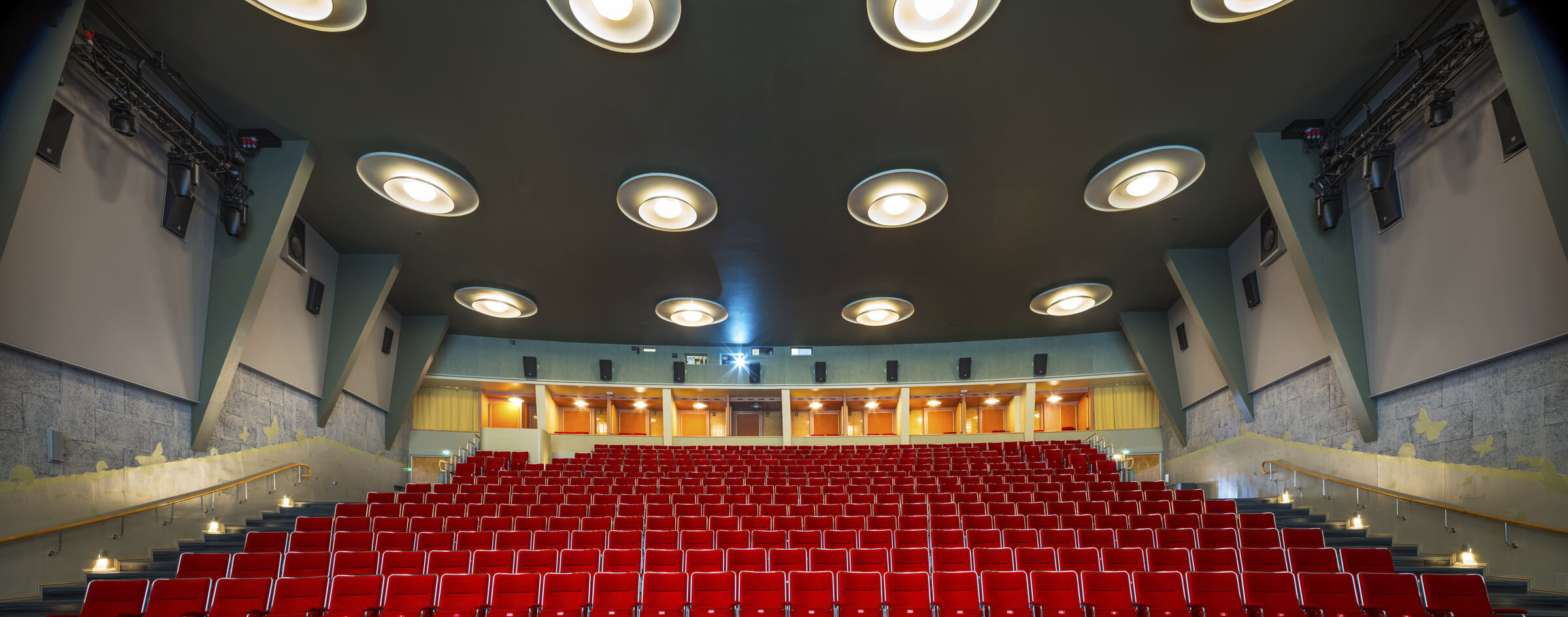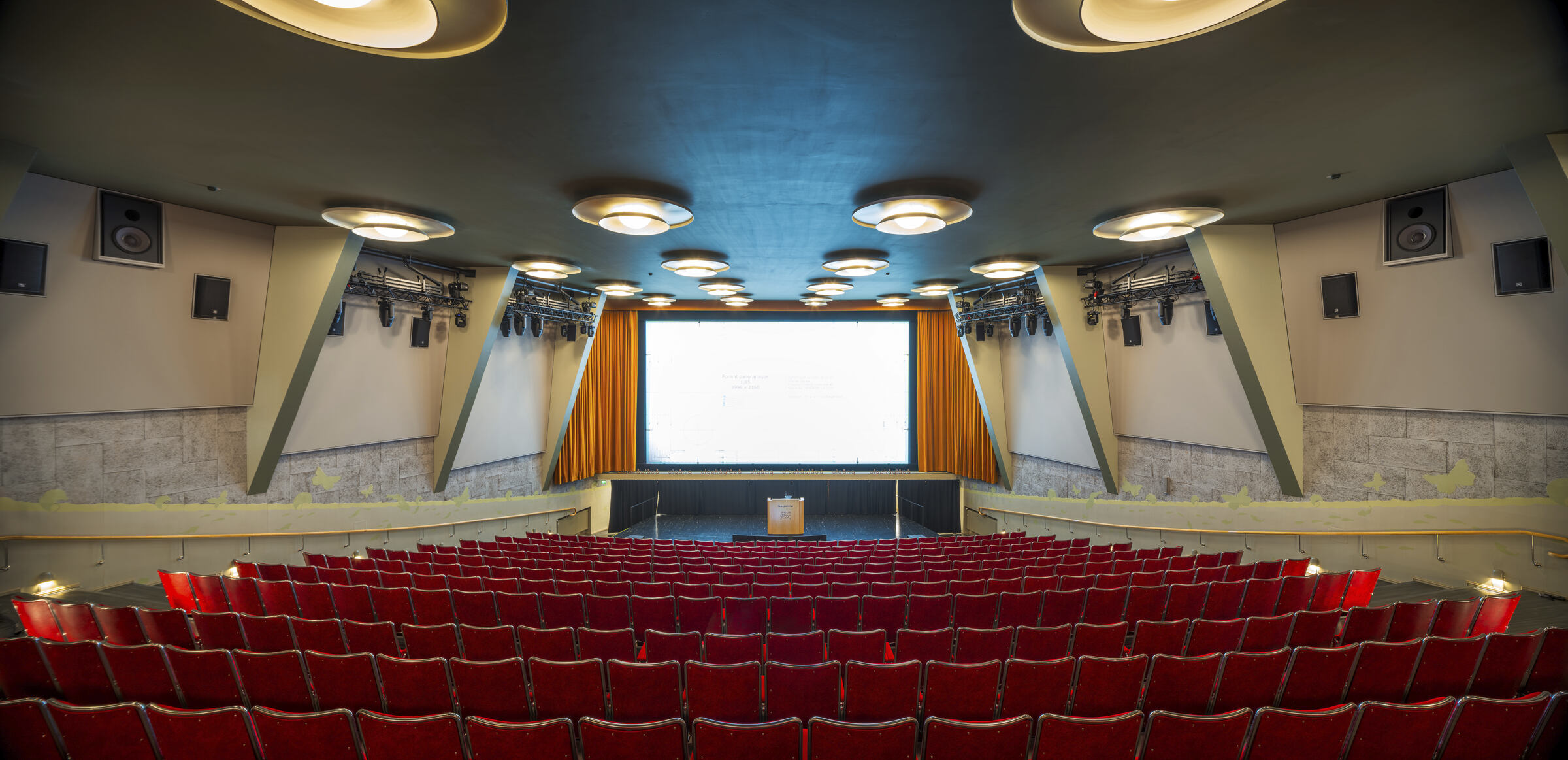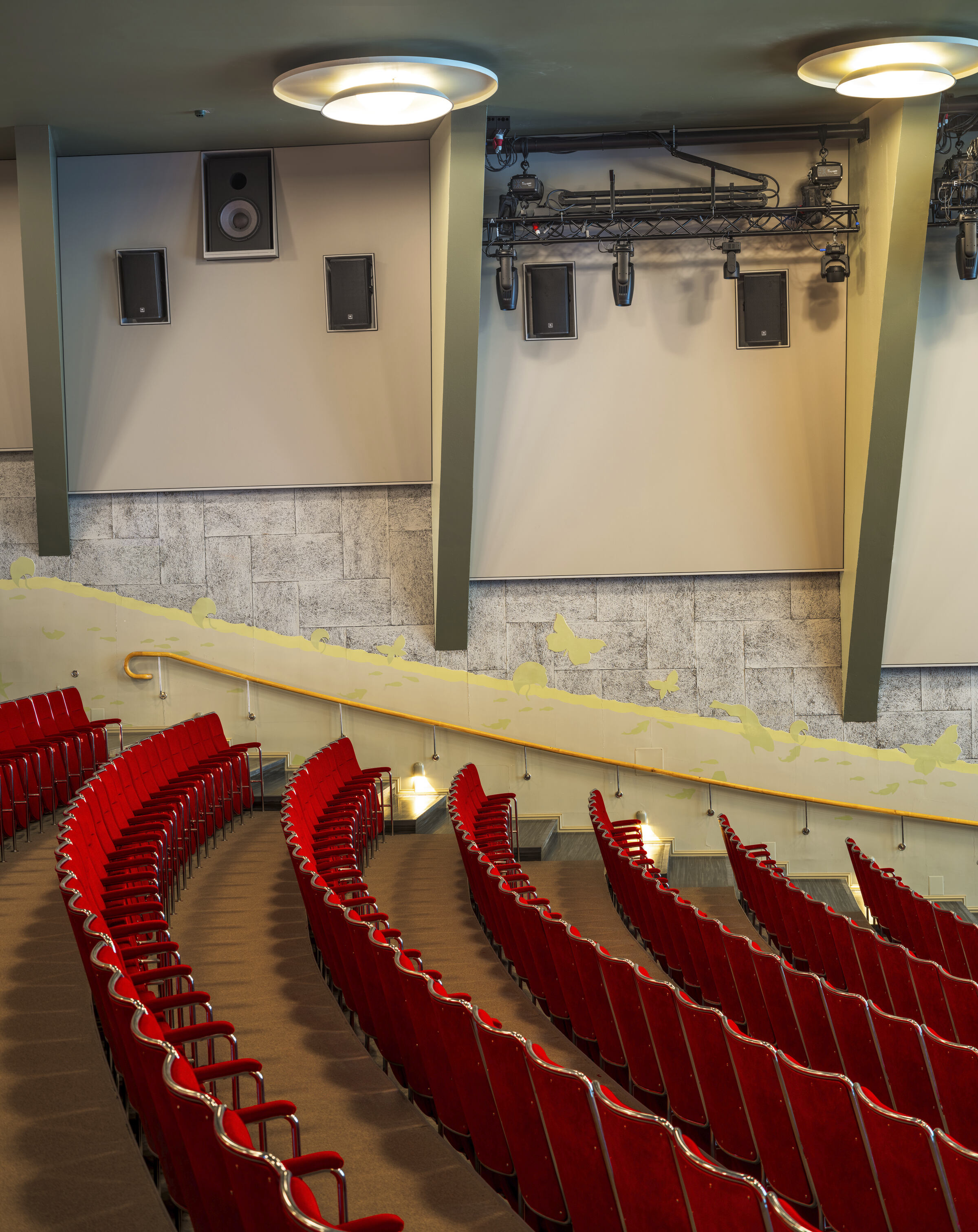 Salės akustika buvo pagerinta pridedant garsą sugeriančių medžiagų prie sienų ir salės galinės dalies. Ant šoninių sienų buvo sumontuota aštuoni garsą sugeriantys Clipso So Acoustic paneliai (standartinė spalva 4052 Cendre/Ash). Ecophon Clipso™ yra akustinė ištempiamoji audinio sistema, kuri gali būti naudojama sienoms ir luboms aptraukti. Audinys montuojamas greitai ir tvarkingai, nesinaudojant šiluma, todėl galima sukurti unikalius sprendimus per trumpą laiką.
