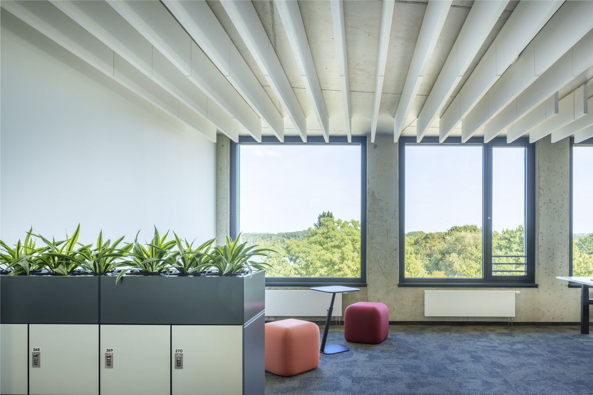 Naujasis EUREF (European Energy Forum) Campus Diuseldorfe sukurtas kaip inovacijų centras, suburiantis verslą, mokslą ir tyrimus tvarioje, į ateitį orientuotoje aplinkoje. Schneider Electric Operations Consulting GmbH, įsikūrusios šiame komplekse, tikslas buvo sukurti atvirą darbo erdvę, kuri skatintų bendradarbiavimą, bet kartu užtikrintų susikaupimą ir gerą savijautą. Pagrindiniu iššūkiu tapo tinkamos akustinės pusiausvyros pasiekimas.