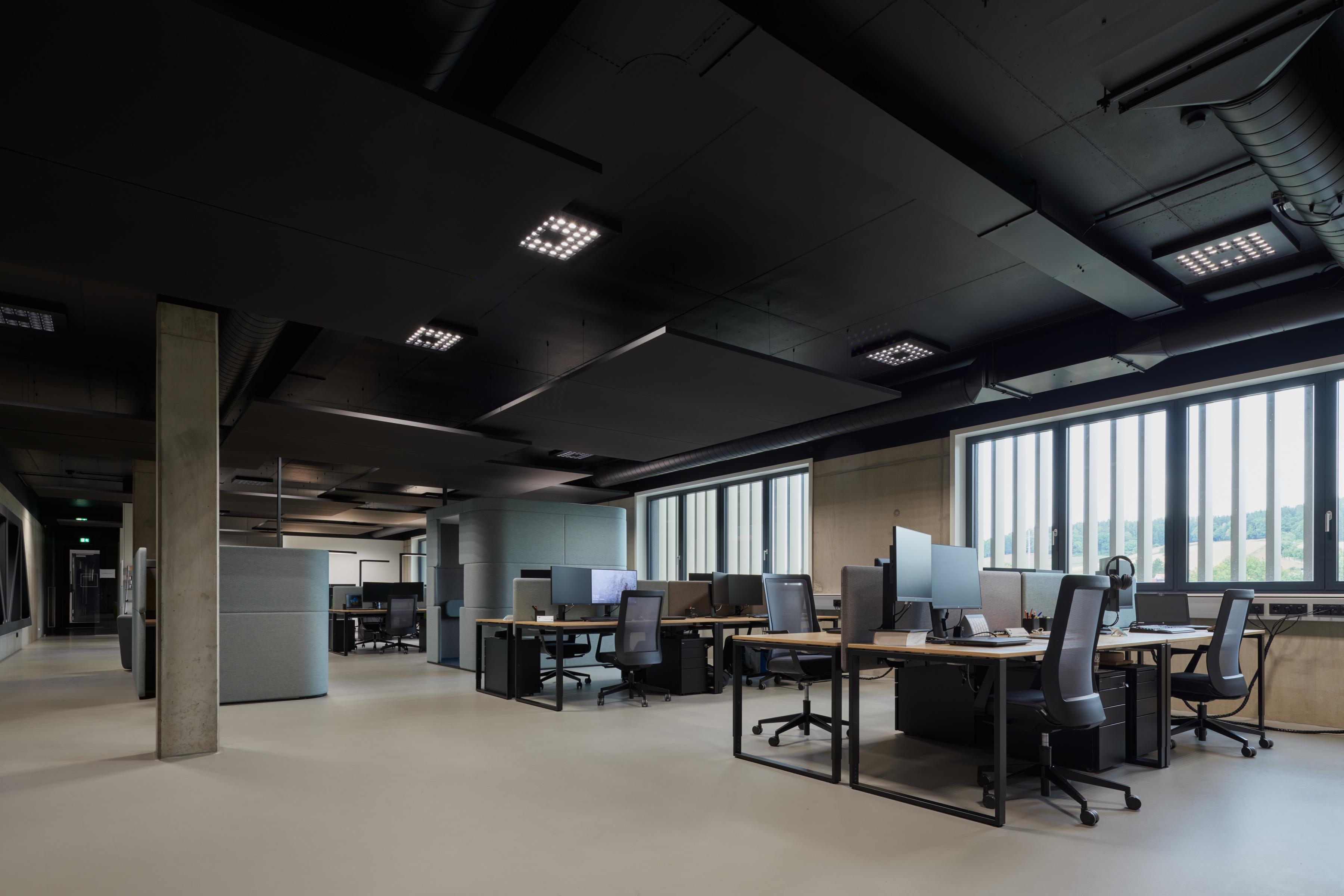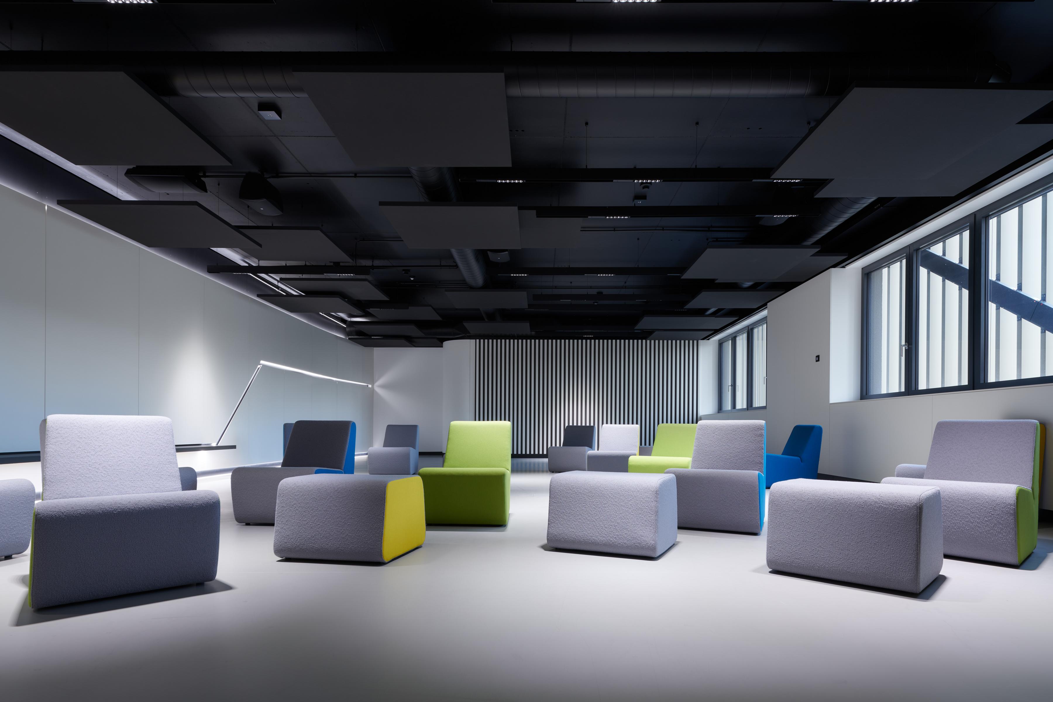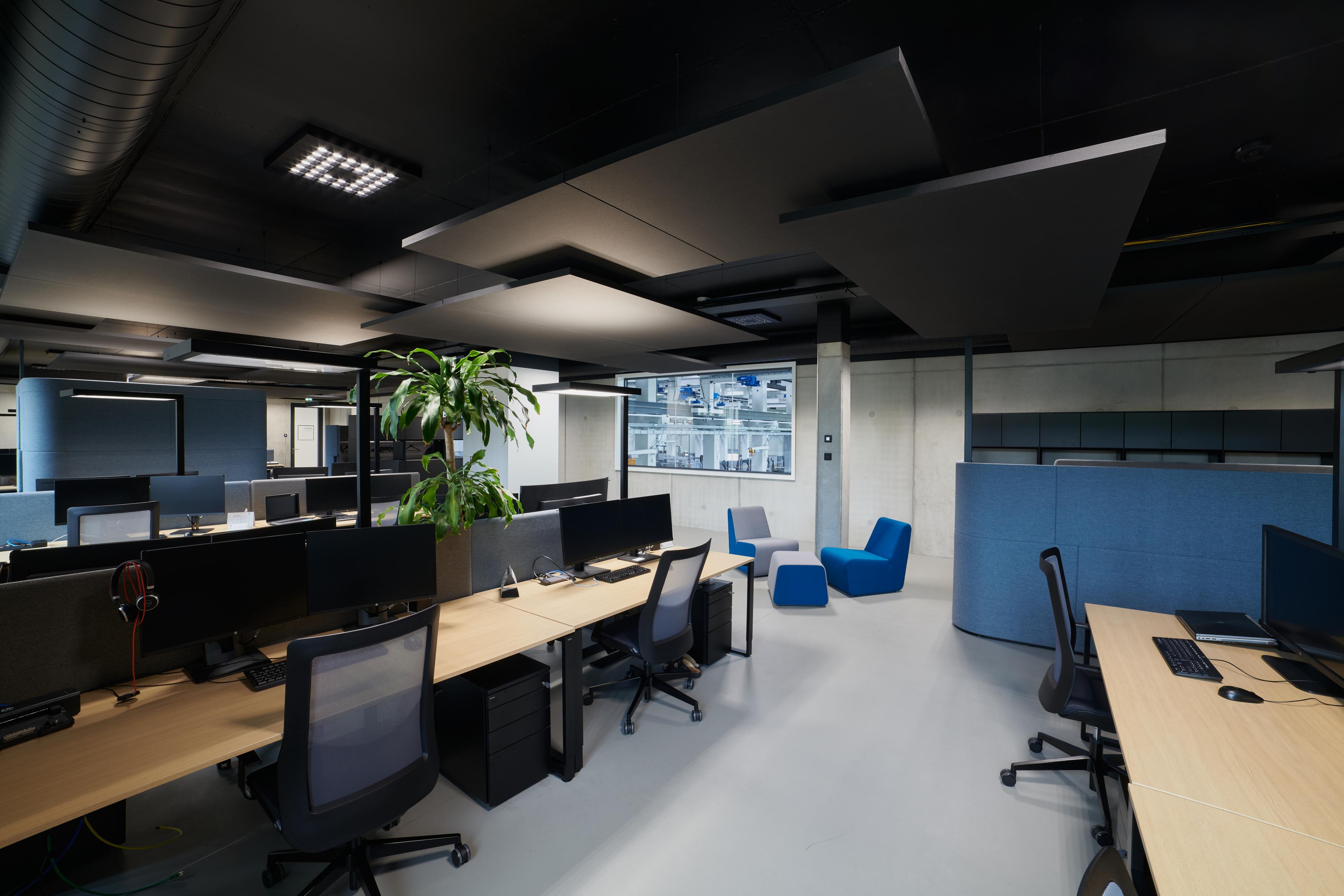 Visose patalpose, tiek laboratorijose, tiek kambaryje Holodeck, tiek atviro biuro darbo vietose buvo pasirinktas Ecophon Solo™ Rectangle Dark Diamond spalvos. Laisvai pakabinamos plokštės puikiai dera prie futuristinio minimalistinio dizaino koncepcijos ir sukuria malonią akustinę atmosferą.