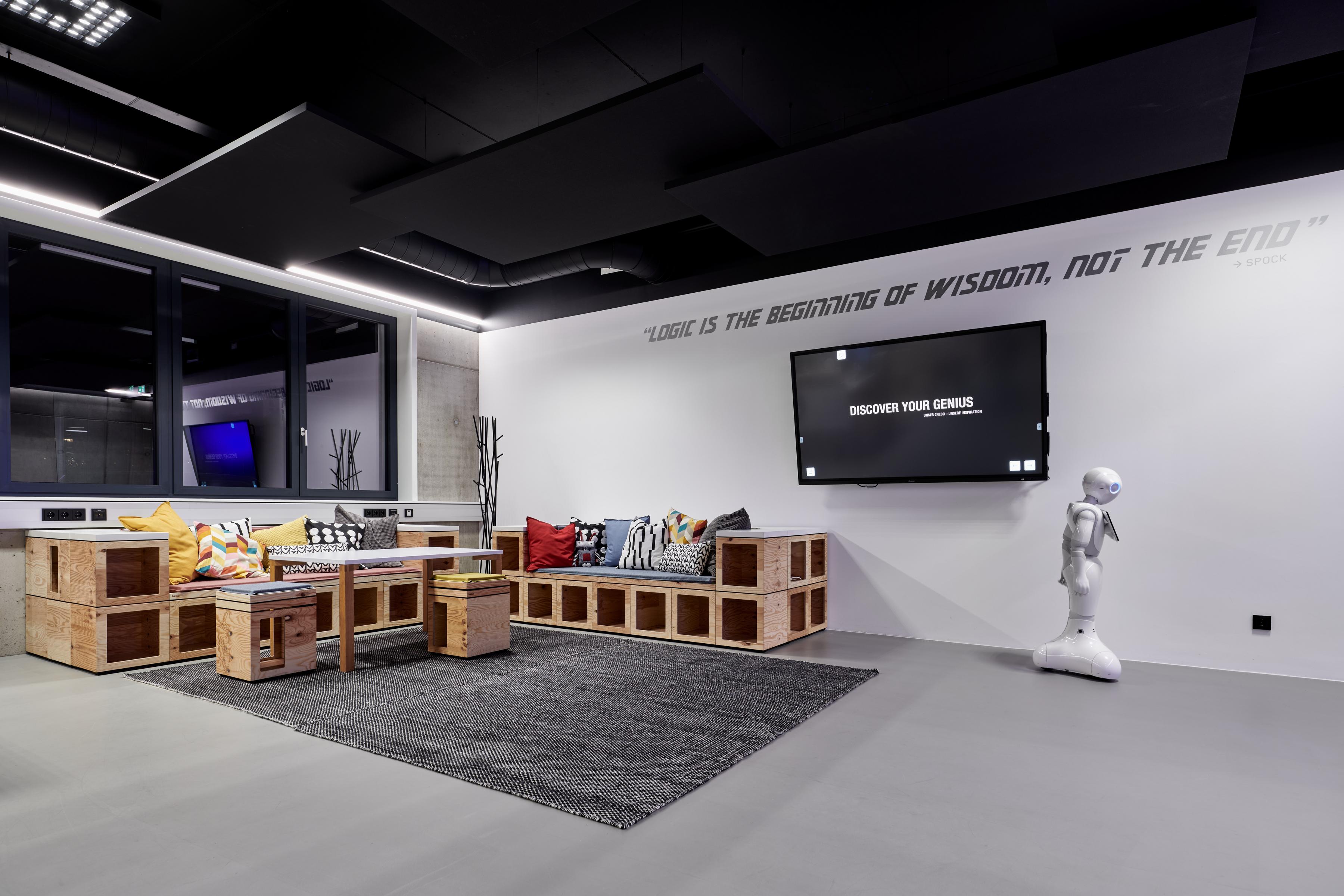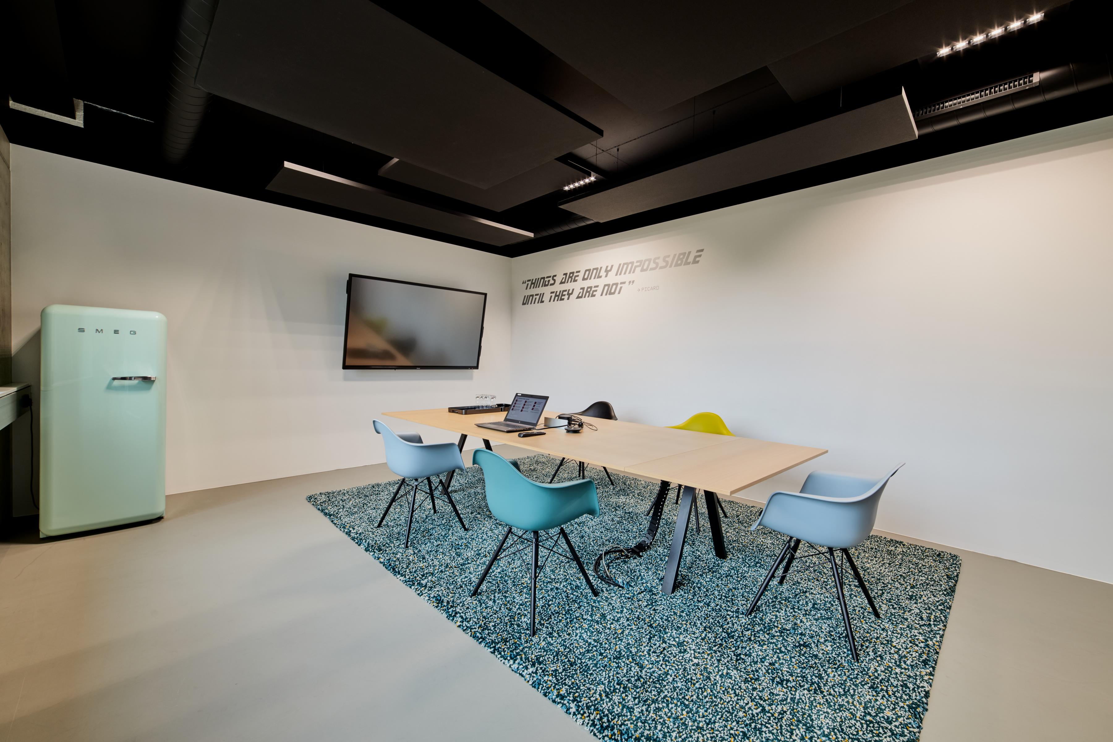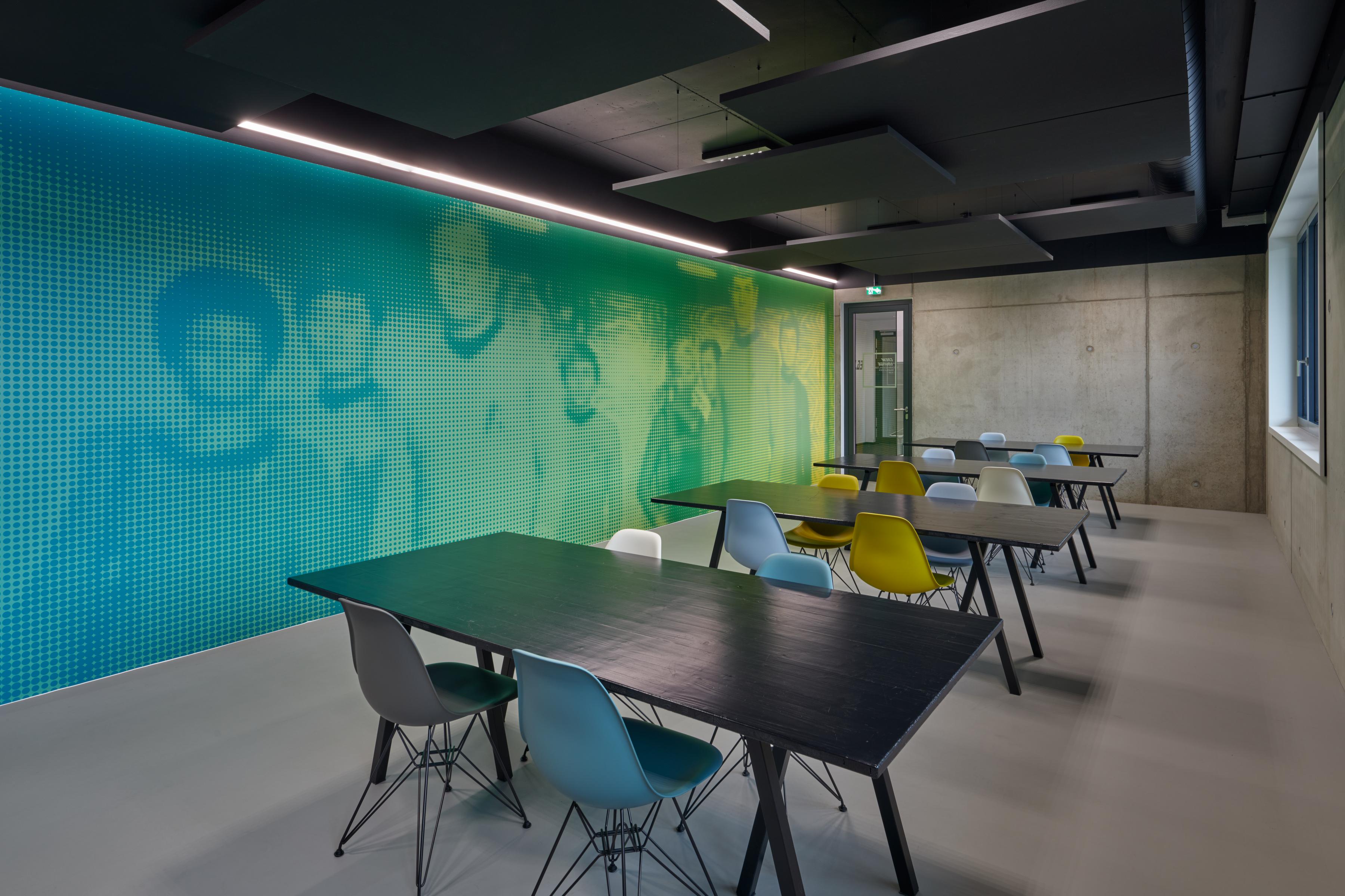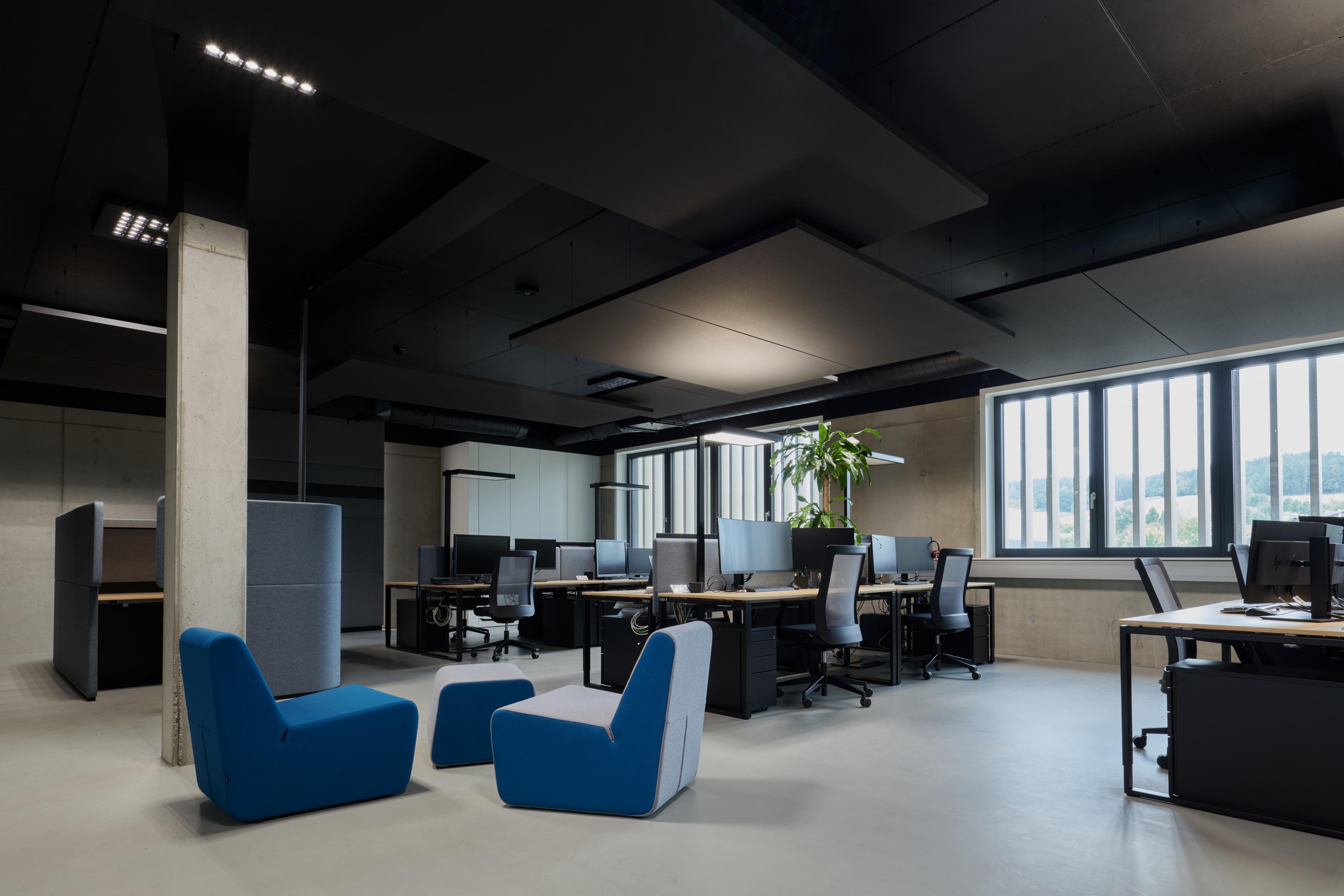 Visose patalpose, tiek laboratorijose, tiek kambaryje Holodeck, tiek atviro biuro darbo vietose buvo pasirinktas Ecophon Solo™ Rectangle Dark Diamond spalvos. Laisvai pakabinamos plokštės puikiai dera prie futuristinio minimalistinio dizaino koncepcijos ir sukuria malonią akustinę atmosferą.