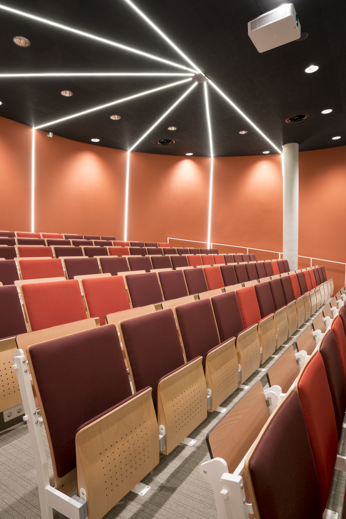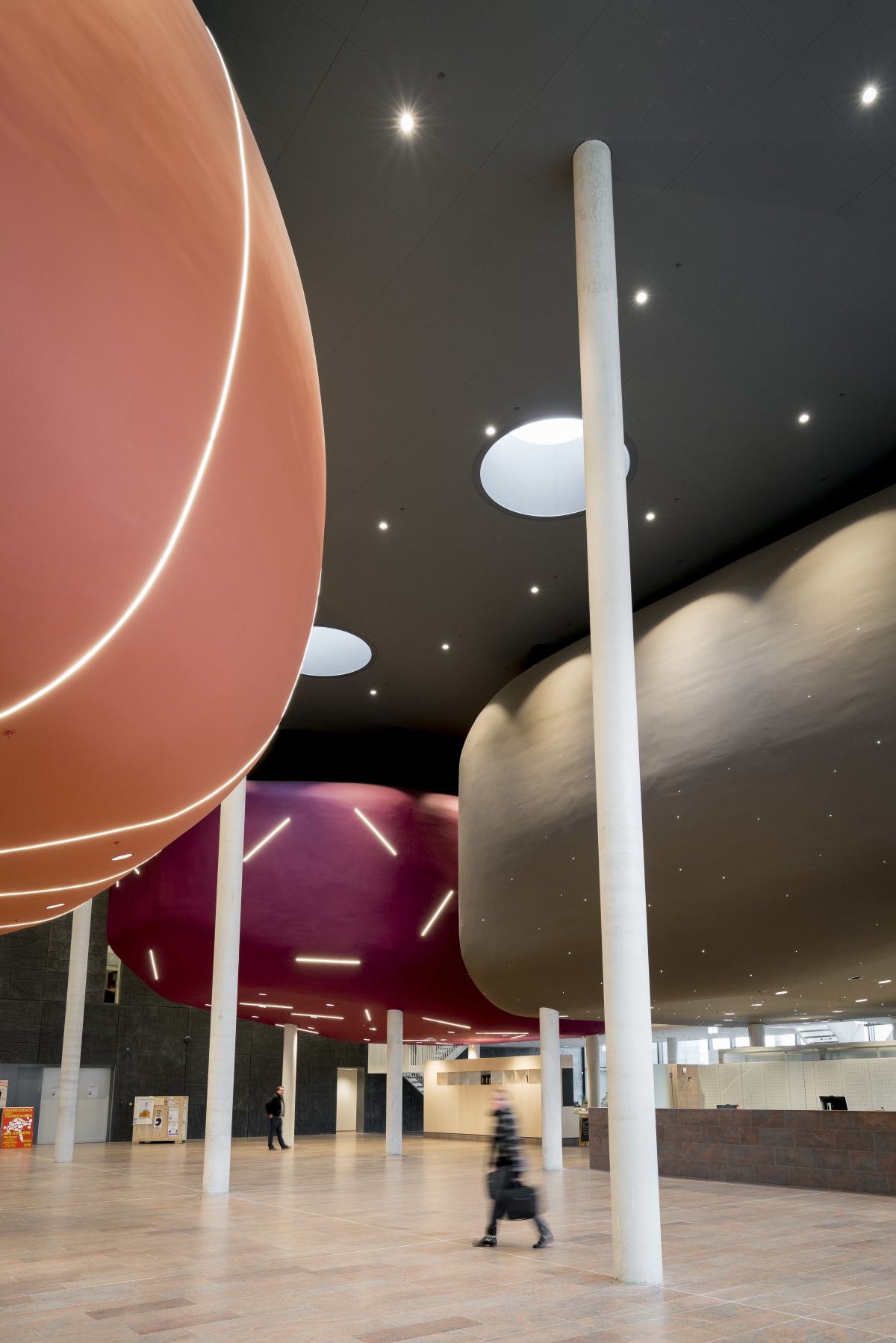 “Een ander belangrijk uitgangspunt voor het ontwerp waren de kleuren. Die wilde ik warm en helder tegelijk maken. Ook wilde ik die zowel binnen als buiten in de gevels doorvoeren. Bovendien wilde ik het beton van de constructie zichtbaar houden, met een natuurlijke aanblik. Akoestische waarden waren bij het ontwerp zeker van belang: verstaanbaarheid is cruciaal. En het geluid uit de zalen mocht naar buiten toe niet hoorbaar zijn. De plafonds voldoen aan al mijn uitgangspunten. Wat ik prettig vind aan werken met Ecophon is dat ik een goede keuze van hen krijg zodat ik op basis daarvan kan bepalen wat het beste past in mijn idee. Als architect bedenk je hoe het gaat worden en wil je die droom laten landen.”