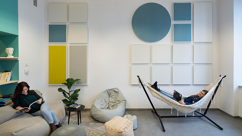 Het ontwerp en de geplande inrichting van de kantoren werden grondig geanalyseerd om te bepalen welke akoestische oplossingen nodig waren en waar, om ervoor te zorgen dat de teams zich comfortabel zouden voelen. De uiteindelijke indeling en kleurenschema's zijn door de ontwerpers gekozen. De akoestische panelen van Ecophon op de wanden en het plafond waren effectief in het verminderen van het geluidsbereik in de open-space kantoren en maakten het praten in de vergaderruimten comfortabeler.