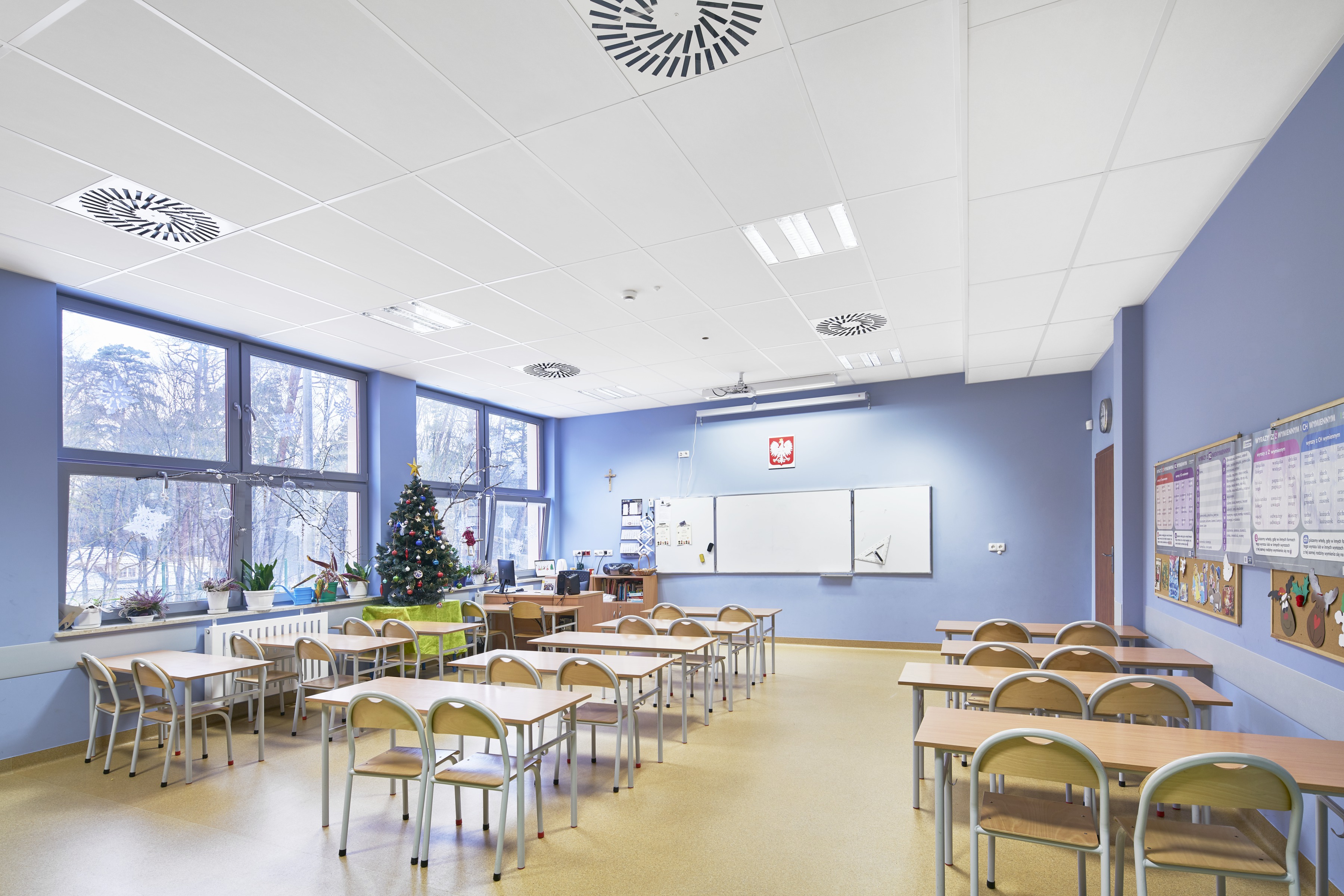 W budynkach szkolnych (zwłaszcza w podstawówkach) źródłem największej dokuczliwości jest hałas. Nie chodzi tu o hałas przenikający do pomieszczeń z zewnątrz (np. hałas komunikacyjny) lecz ten, który jest związany z aktywnością uczniów. Jest on szczególnie wysoki w czasie rekreacji, zajęć ruchowych czy też pracy w grupach. Natomiast w trakcie zajęć polegających na komunikacji werbalnej, czy to w klasach lekcyjnych czy w salach sportowych, bardzo często występują problemy z niedostateczną zrozumiałością mowy. Jaki wpływ ma akustyka klas lekcyjnych na samopoczucie i efektywność pracy uczniów i nauczycieli można zobaczyć na przykładzie Szkoły Podstawowej nr 340 w Warszawie. Jej budynek przeszedł w 2018 roku modernizację akustyczną, dzięki której jej pomieszczenia spełniają dzisiaj wymagania tzw. normy pogłosowej PN-B-02151-4:2015-06. Kilka miesięcy po ukończeniu prac przeprowadzono w szkole badania ankietowe, w których nauczyciele i uczniowie mogli ocenić skalę zmian w ich funkcjonowaniu wywołanych poprawą akustyki. Raport z badań można znaleźć tutaj (https://www.ecophon.com/pl/articles/case/sp-340-warszawa/).