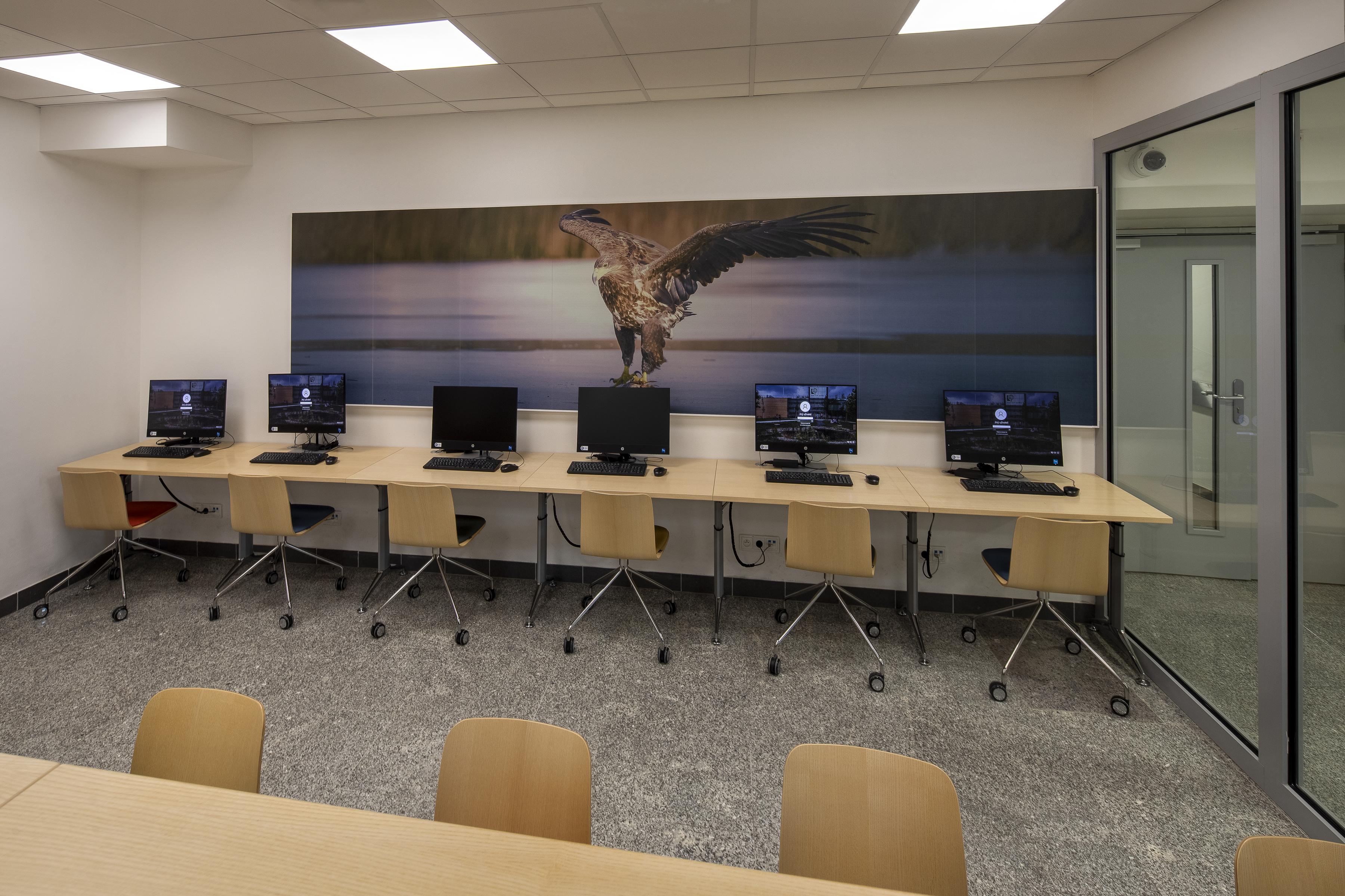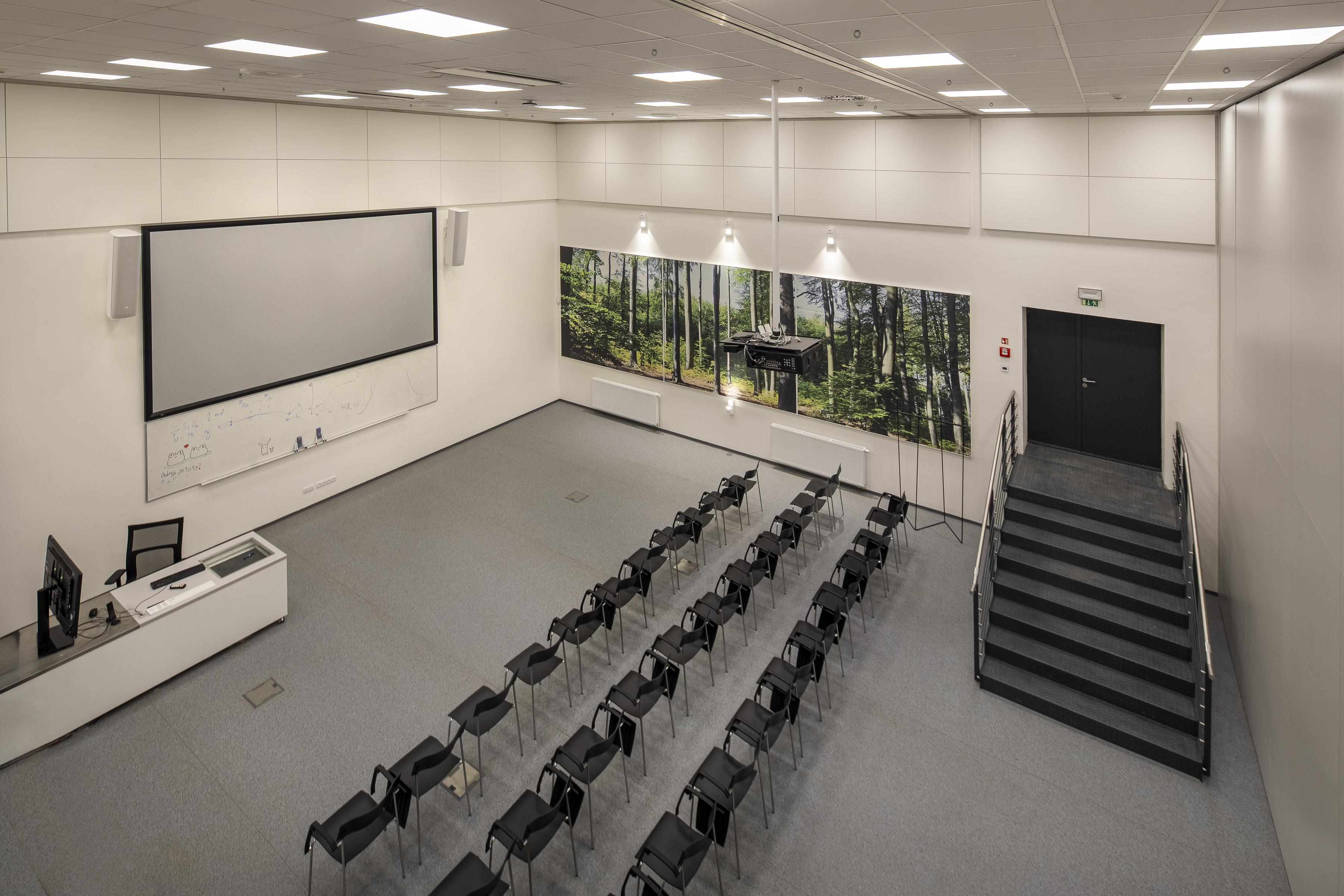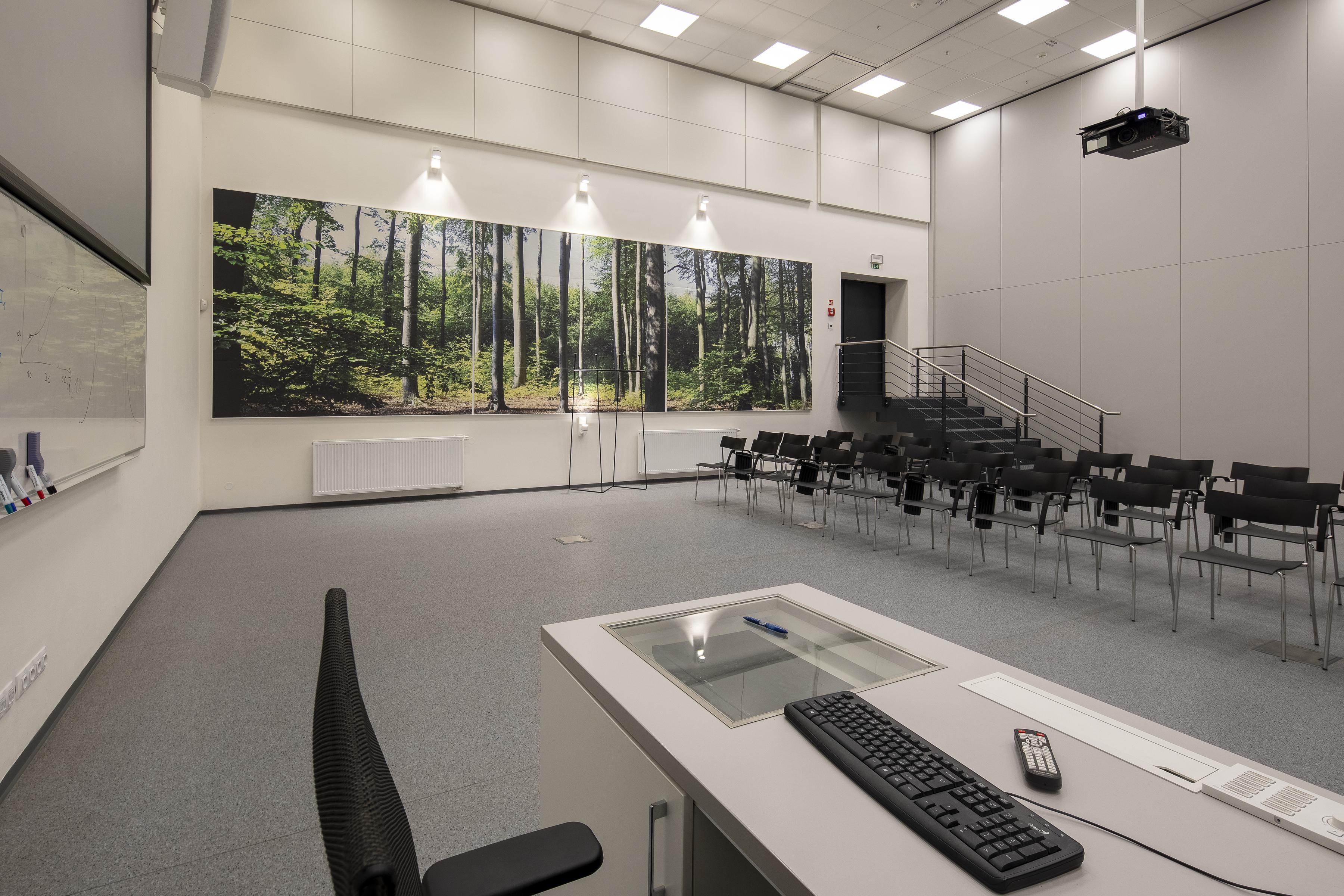 System Focus Dg pozwala użytkownikom na łatwy dostęp do przestrzeni nad sufitem. Korytarze zostały oceniane jako wystarczająco wytłumione i komfortowe akustycznie. Ścisła współpraca architektów i akustyków z Wydziałem Leśnictwa i Nauk o Drewnie CZU zaowocowała także nowatorskim projektem akustycznych okładzin ściennych i sufitowych paneli Ecophon Solo™ w salach lekcyjnych, na których wydrukowano tematyczne fotografie natury wybrane przez wykładowców wykorzystujących technologię druku UV.