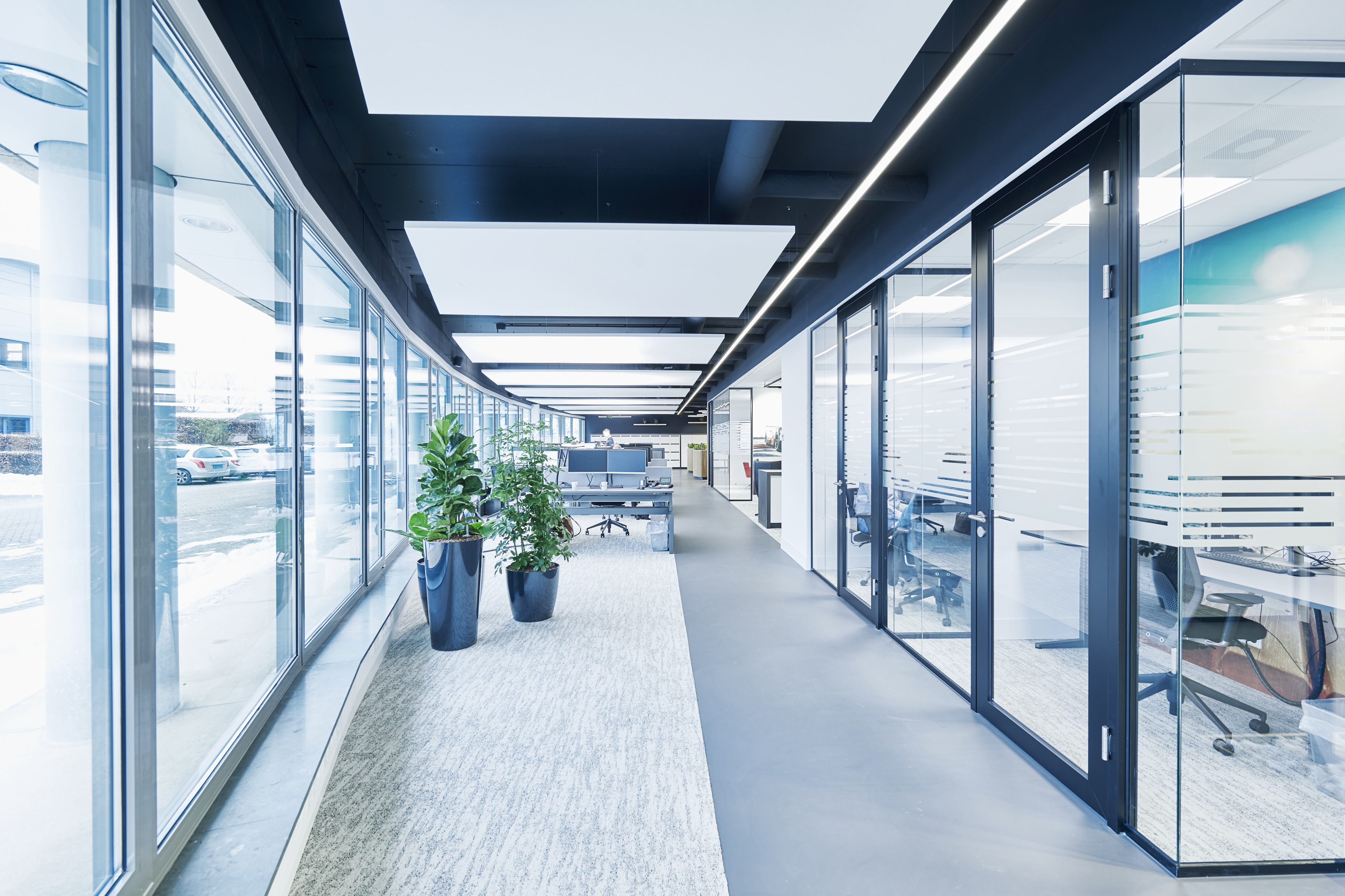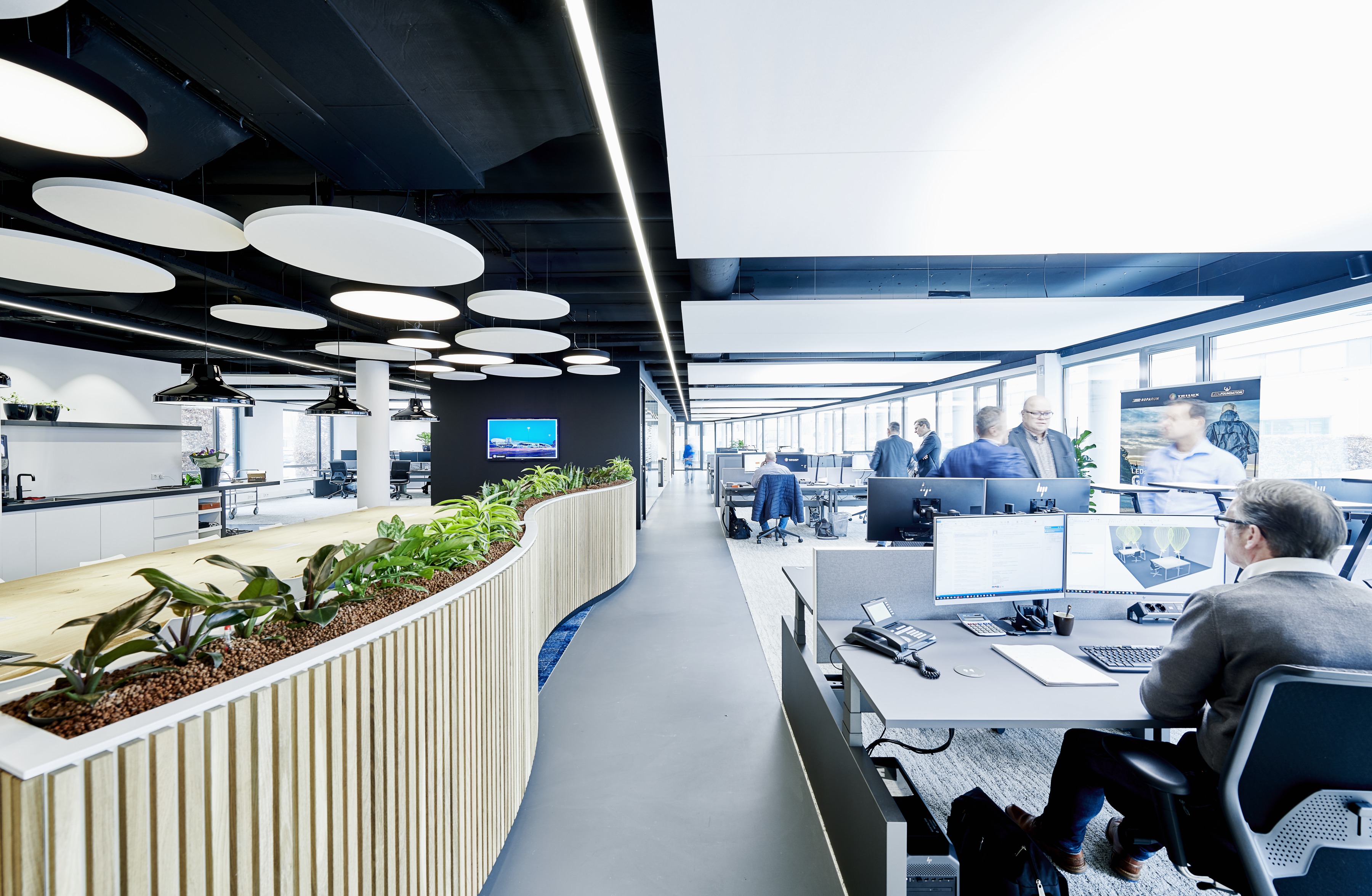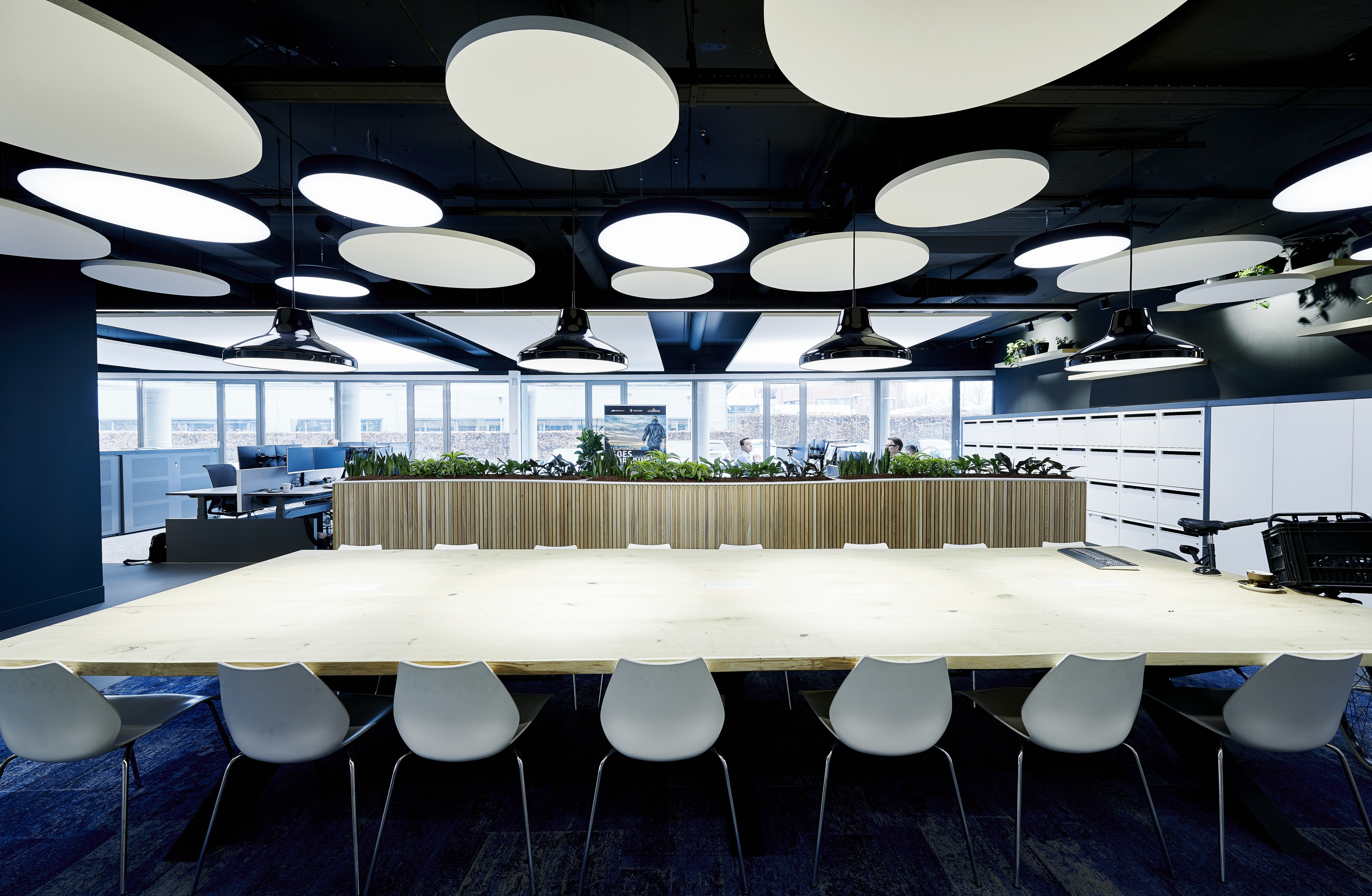 Aby stworzyć przyjemne i spokojne środowisko akustyczne, w całym pomieszczeniu zastosowano panele sufitowe Ecophon Solo ™ w różnych kształtach. Nowe biuro stało się miejscem, w którym światło i akustyka optymalnie wpływają na przyjemne środowisko pracy, w którym łączą się innowacje, kreatywność, współpraca i produktywność.