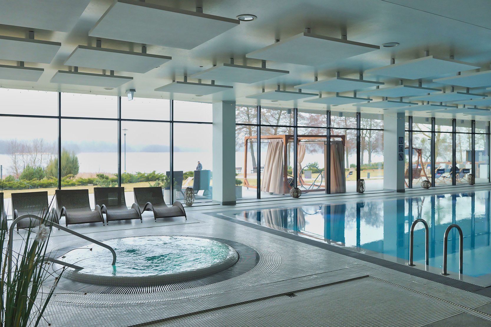 W Notera Hotel Spa technologia projekcji laserowej Ecophon pozwoliła przeprowadzić szybki i niezwykle precyzyjny montaż akustyczny w czasie krótkiego przestoju obiektu. Efektem jest wyraźnie wyższy komfort i bardziej wyciszona, spokojna atmosfera w strefach basenowych i spa.