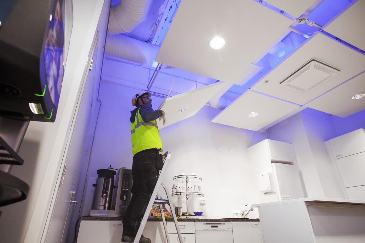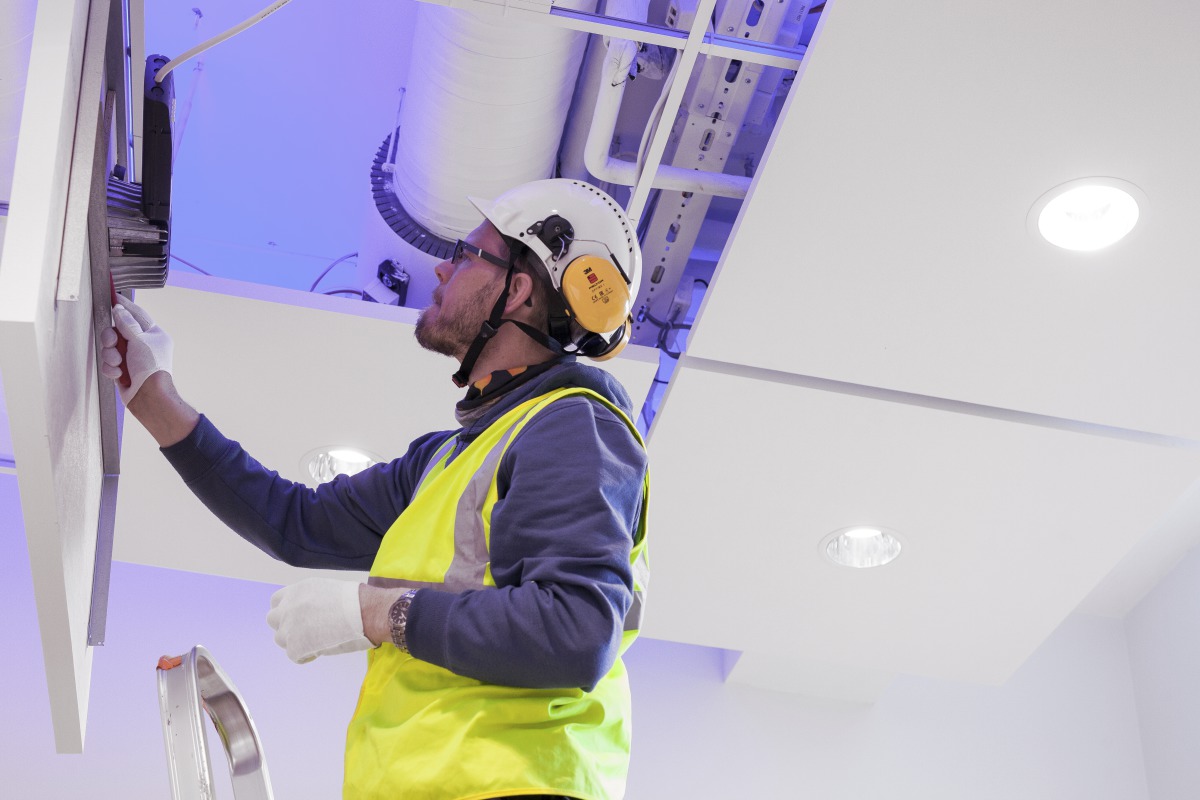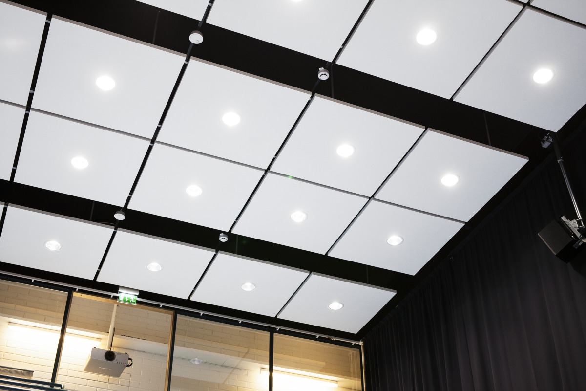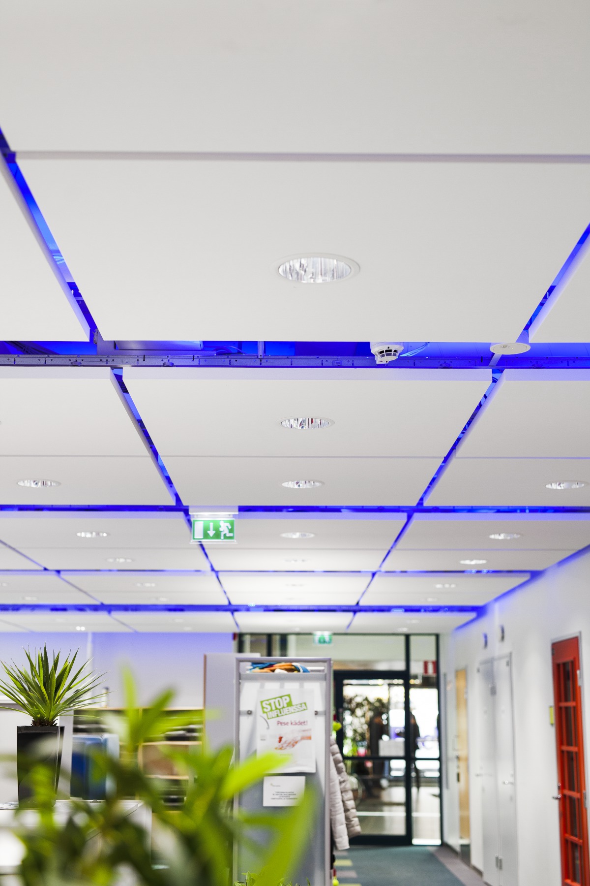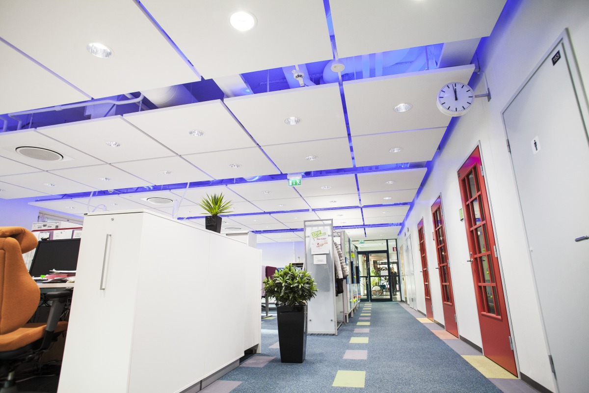 Man bestämde sig för att använda A-klassade absorbenter i alla tak och heltäckningsmattor på golven. Akustiktaken skulle dessutom ge ett ljust, svävande intryck i kontoren och vara enkla att demontera för exempelvis rengöring. Valet föll på Ecophon Solo™ Matrix, som uppfyllde alla dessa krav. Takets svävande effekt förstärktes ytterligare med hjälp av indirekt belysning.