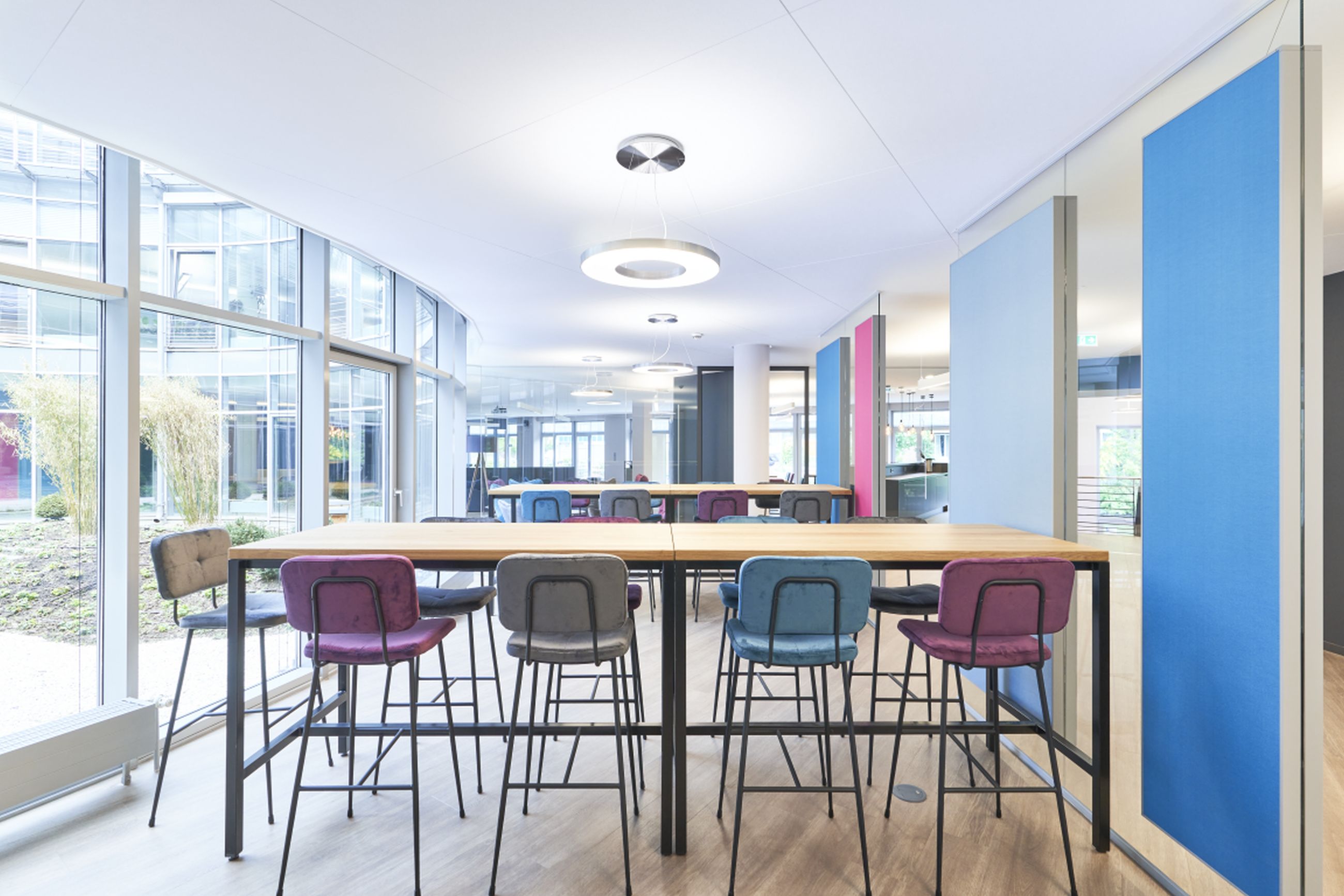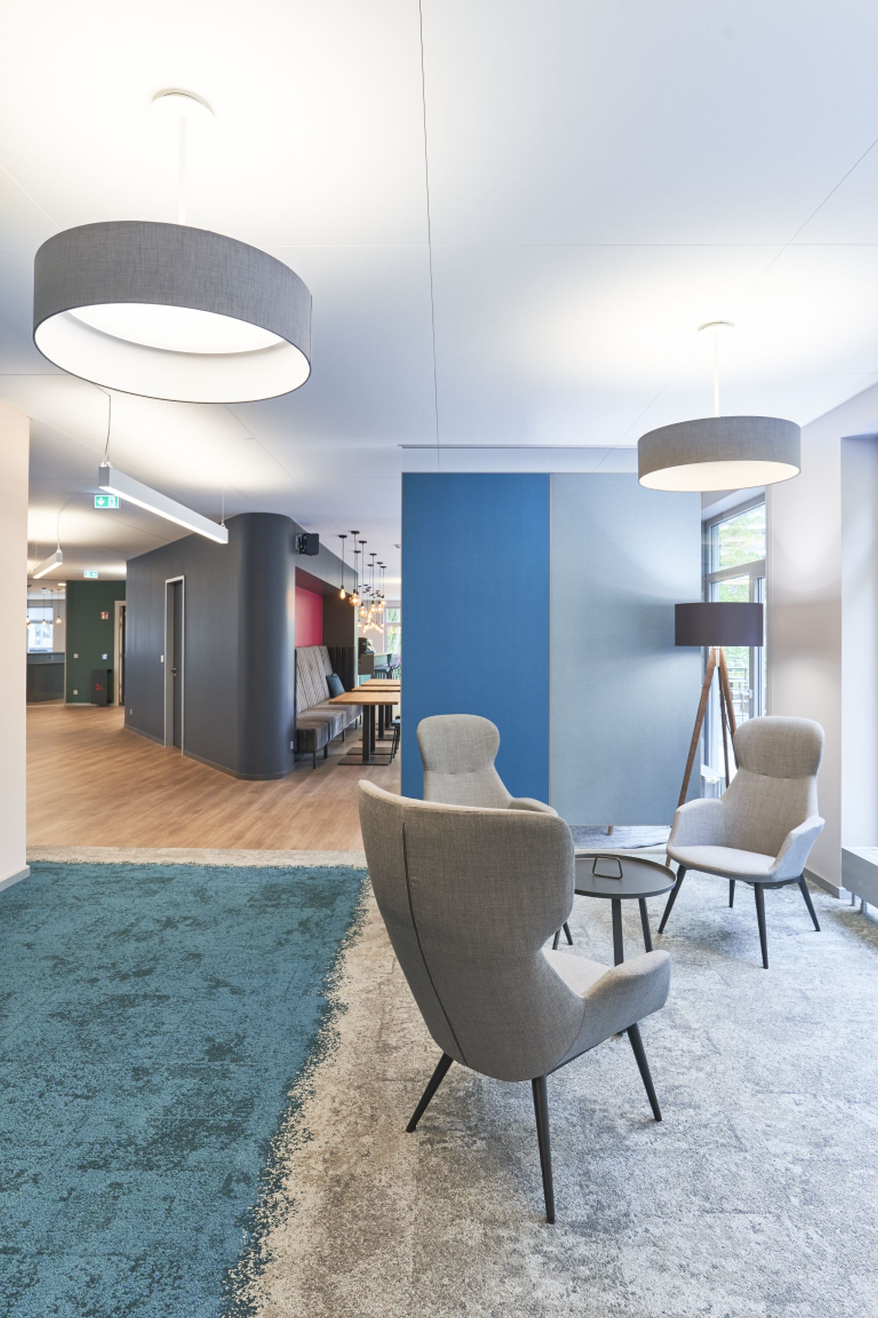 Arkitekterna bestämde sig för väggabsorbenterna Ecophon Akusto™ Wall C/Texona. Ytskiktet Texona finns i olika färger, vilket gör att de blå, gröna och senapsgula nyanserna som används i det öppna kontorslandskapet passar fint ihop och samtidigt harmonierar med bottenvåningens starkare kulörer som Menthol och Cranberry. När det gäller akustiktaken ville man däremot skapa en lugn och enhetlig stil som dessutom passar bra till det biodynamiska ljuskonceptet. Därför föll valet på Ecophon Focus™ Ds – ett högabsorberande undertak med dolt bärverk som kan demonteras underifrån. Det gör att man alltid har enkel åtkomst till installationerna ovanför taket. Tillsammans skapar plattorna en enhetlig yta. Kombinationen av tak- och väggabsorbenter uppfyller alla krav enligt standarderna DIN 18041 och ASR A3.7 Lärm.
