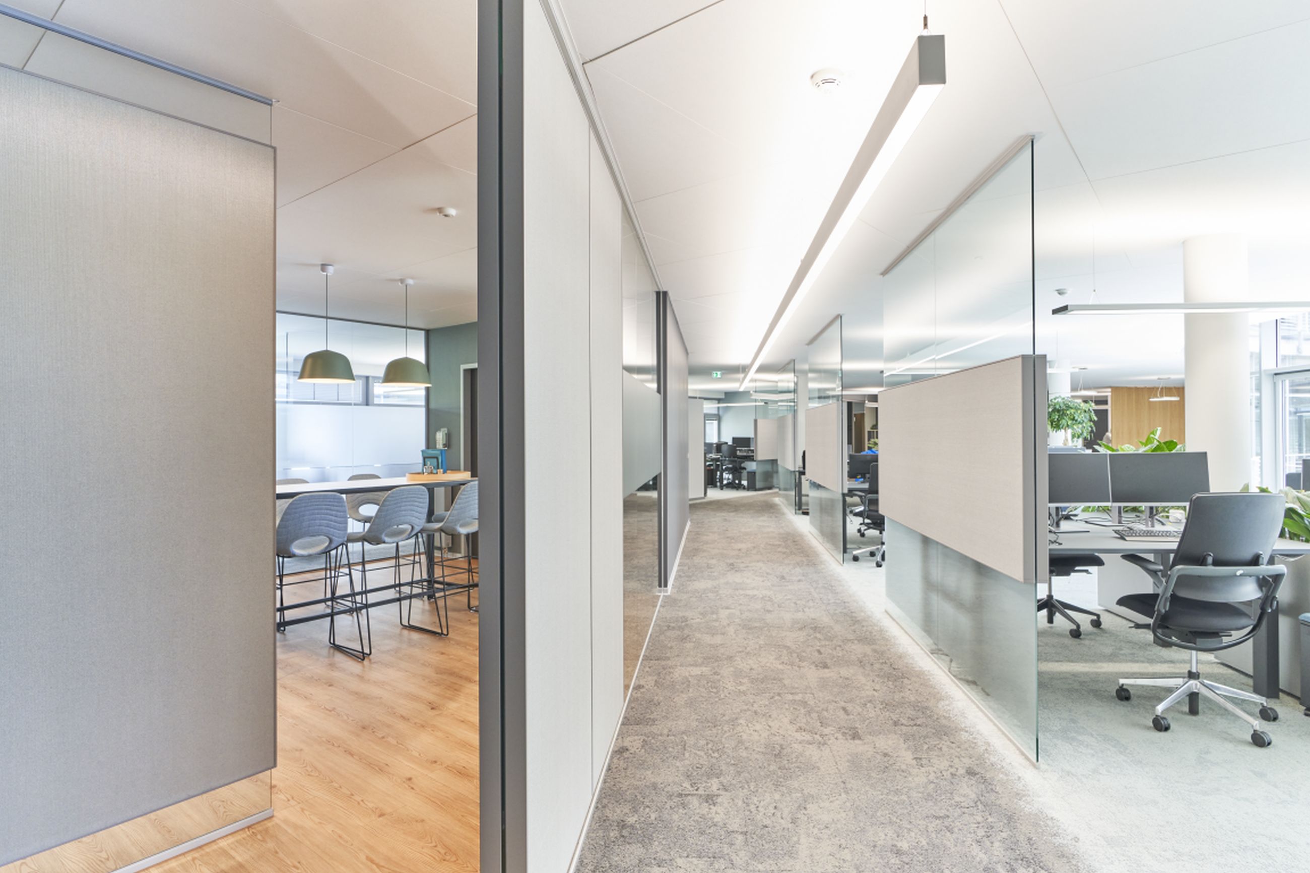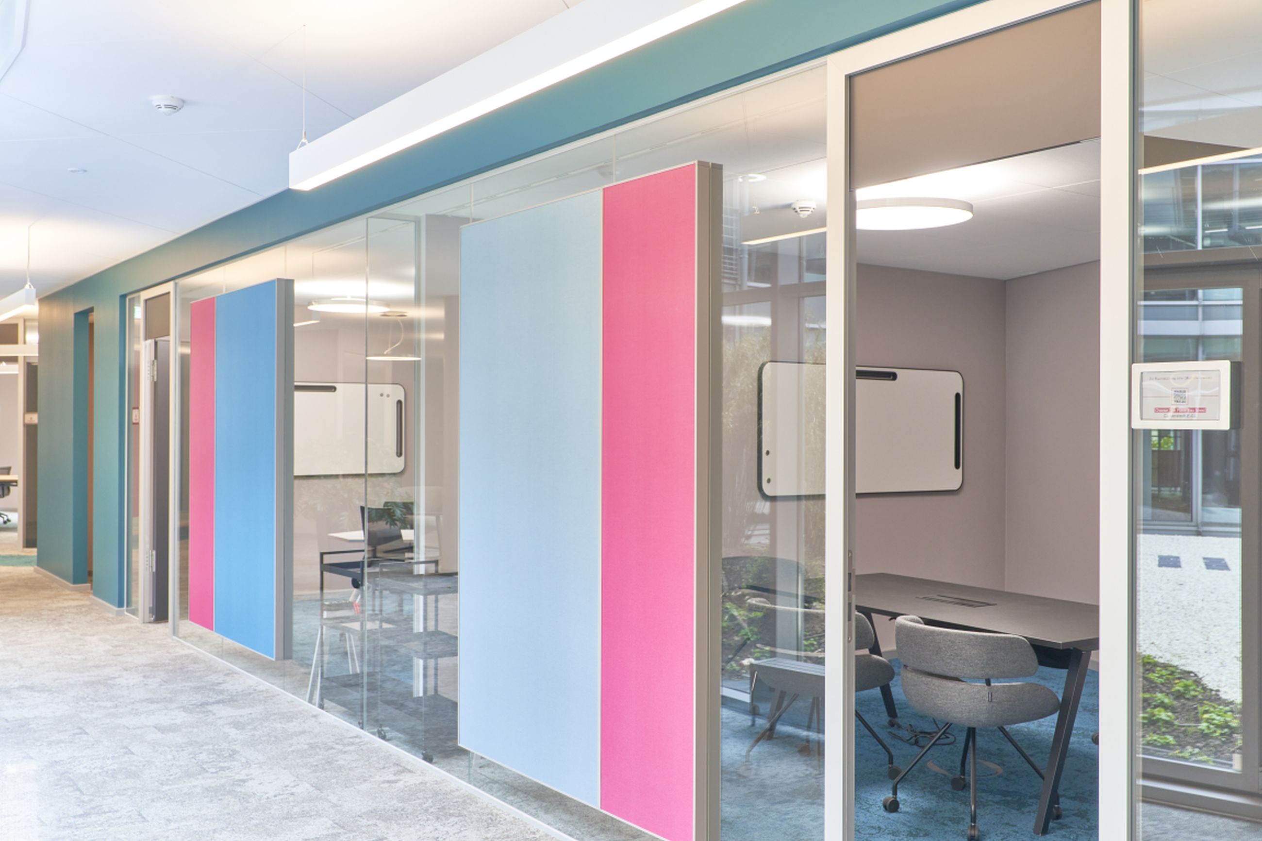 Sopra Steria involverade medarbetarna redan tidigt i beslutsprocessen. Ett projektteam på fem personer valde ut lämpliga glasväggar med monterade väggabsorbenter, som utgör visuella och akustiska rumsavdelare i de öppna kontorslandskapen.