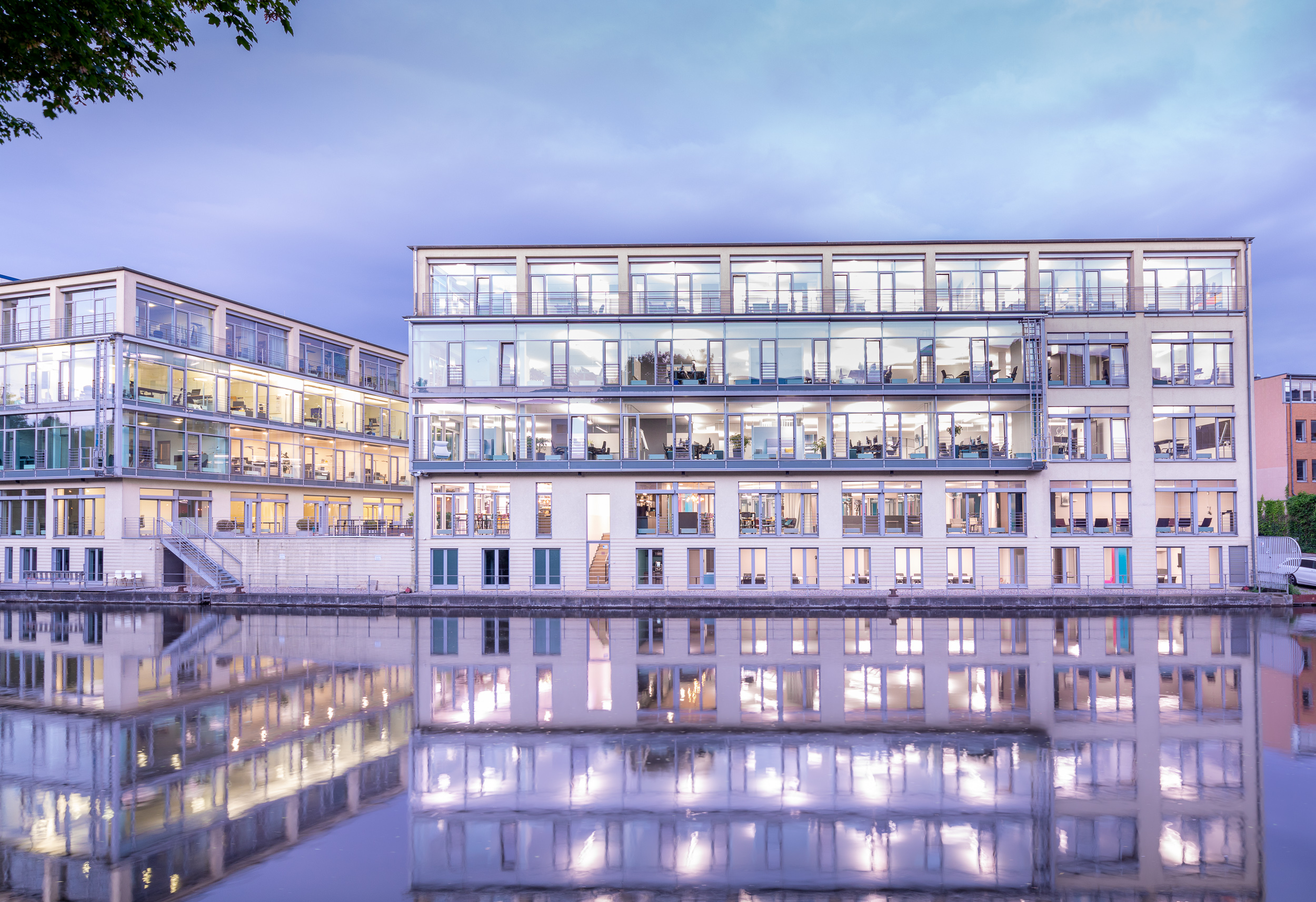 Arkitekterna skapade arbetsytor med många hörn som vetter ut mot den runda innergården. Varje våning har delats in i olika funktionsområden, som t.ex. vilo- och återhämtningszoner med rum för enskilda samtal eller gruppmöten, koncentrationszoner för individuellt arbete och kommunikationszoner för informella personalmöten. Bottenvåningen med reception, kafé och mötesrum skiljer sig såväl funktionellt som visuellt från de övriga tre våningsplanen, som har en identisk planlösning. Här finns kontorsarbetsplatser för upp till 70 personer per våning. Arbetsytorna är flexibelt utformade, och desk sharing-konceptet tillämpas med hjälp av ett överskådligt system för bokning av mötesrum och arbetsplatser. Biodynamisk belysning, ett nytt ventilationssystem och inte minst ett väl genomtänkt akustikkoncept bidrar till att skapa en produktiv och trivsam arbetsmiljö.
