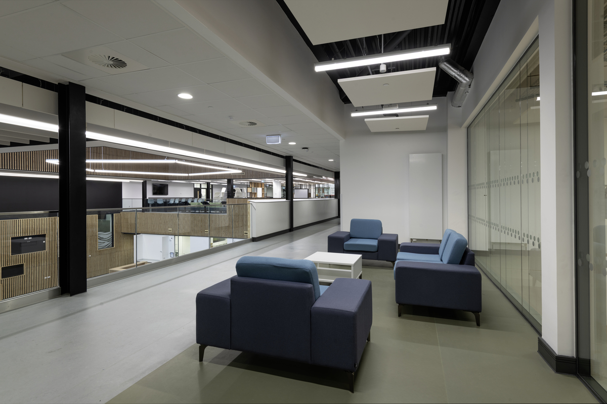 Project size: 2,600 m² grid ceilings, 1,800 Solo Baffle units, 600 Solo Square and Rectangle units, 1,200 m² Akusto Wall C