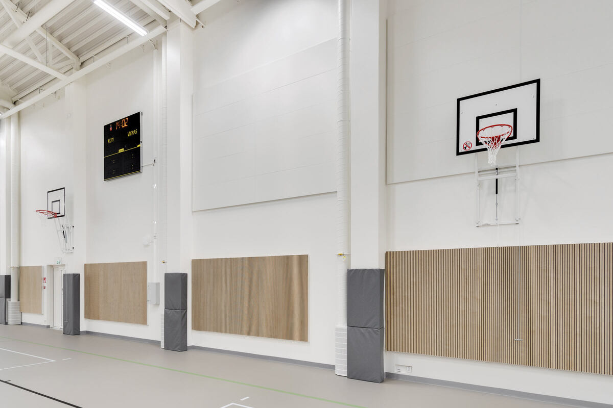 A total of 3,840 m² of Ecophon acoustic panels were installed in the school, with 2,600 m² coming from the low-carbon range (Ecophon Focus™ A CarbonLow and Ecophon Master™ SQ CarbonLow).